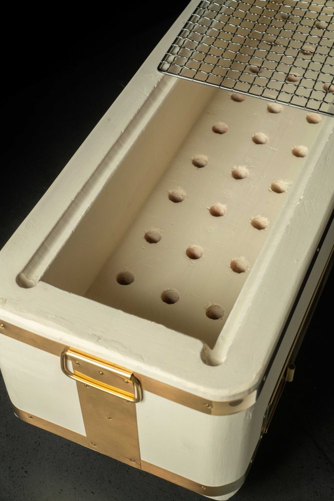 NOUVEAU: Vendu dorénavant avec son Shibu-Uchiwa et trois piques à brochette (420mm) *IMPORTANT: Chaque BBQ est vendu avec 1.5kg de Kishu-Binchotan Premium. trois brochettes, un éventail et une pince. Le Kiridashi Shichirin est fabriqué en découpant manuellement de l’argile en blocs au bout d’un tunnel creusé depuis de nombreuses années, afin de ne pas écraser la poche d’air contenue dans la terre de diatomée naturelle.