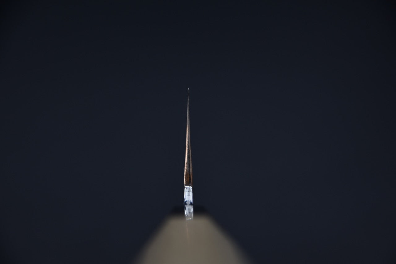 Shirogami #2 se traduit par : Shiro (blanc) et Gami (Acier) et donc; acier blanc #2. Il est nommé ainsi à cause de la couleur de l’emballage dans lequel il était enveloppé à Hitachi Metals. La composition de cet acier est très pure et contient presque seulement du fer et du carbone (1.05%-1.2%). C’est entre les mains de forgerons très expérimentés qu’on se rend compte du potentiel énorme du Shirogami #2. La qualité du traitement thermique et le forgeage à plus basse température sont des éléments clés pouvant permettre au Shirogami #2 de rivaliser, et même de surpasser beaucoup d’aciers modernes. Essayer une lame en Shiro #2 forgée par Tanaka-san, Kisuke Manaka-san ou la forge de Yoshikane et vous verrez !