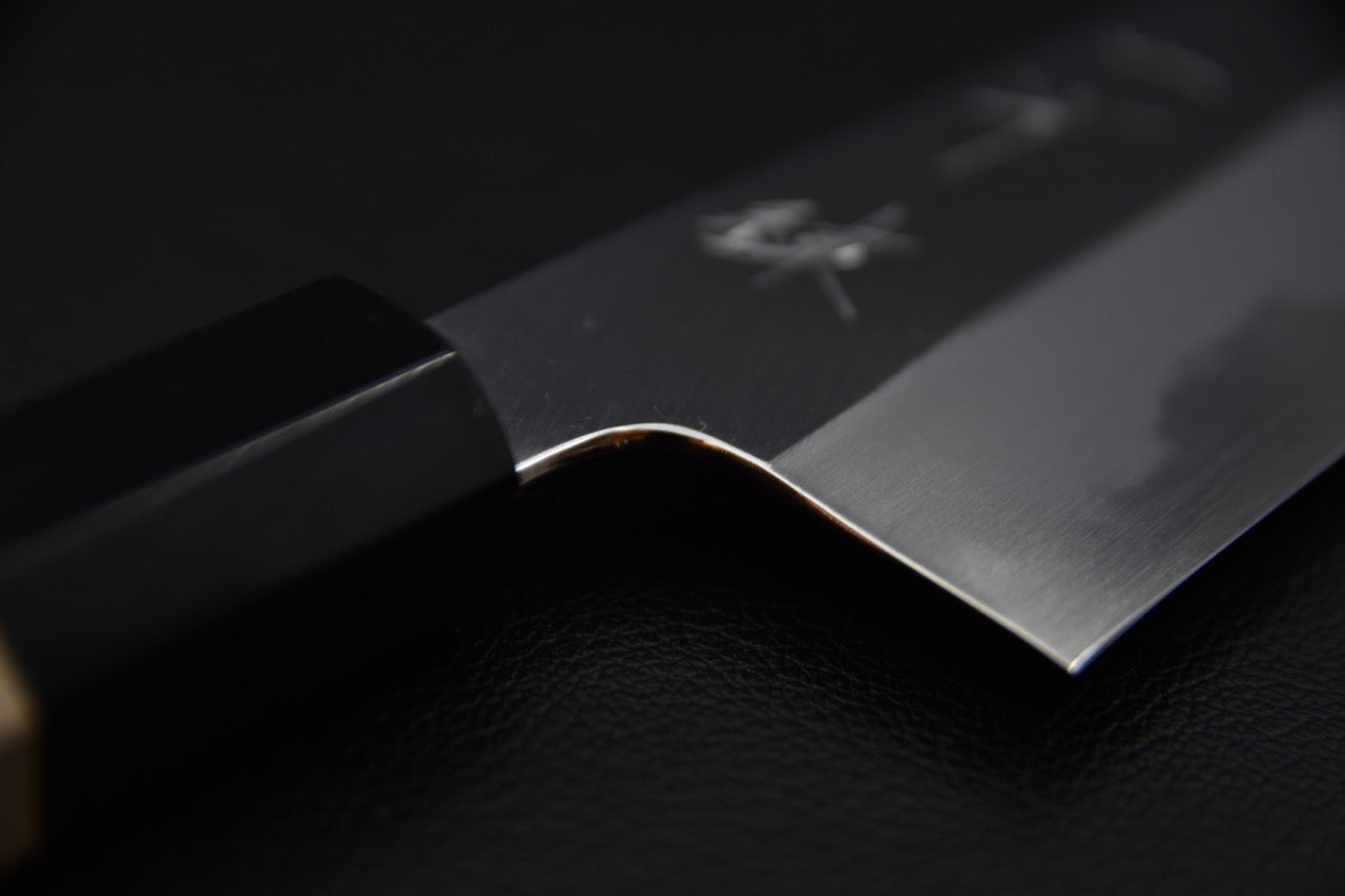 Shirogami #2 se traduit par : Shiro (blanc) et Gami (Acier) et donc; acier blanc #2. Il est nommé ainsi à cause de la couleur de l’emballage dans lequel il était enveloppé à Hitachi Metals. La composition de cet acier est très pure et contient presque seulement du fer et du carbone (1.05%-1.2%). C’est entre les mains de forgerons très expérimentés qu’on se rend compte du potentiel énorme du Shirogami #2. La qualité du traitement thermique et le forgeage à plus basse température sont des éléments clés pouvant permettre au Shirogami #2 de rivaliser, et même de surpasser beaucoup d’aciers modernes. Essayer une lame en Shiro #2 forgée par Tanaka-san, Kisuke Manaka-san ou la forge de Yoshikane et vous verrez !