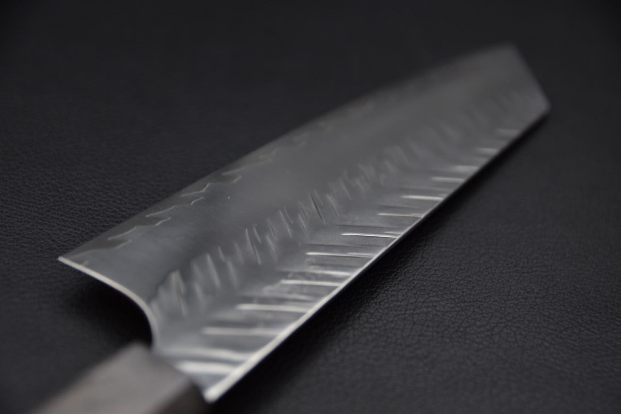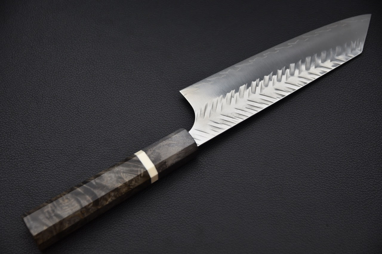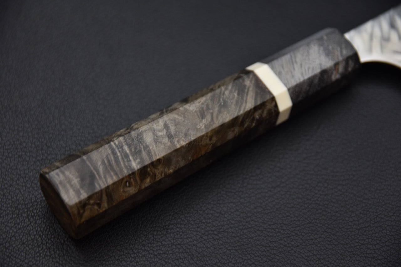 Le motif tsuchime en chevrons martelé à la main donne du caractère à la lame tout en réduisant l’adhérence des aliments. On remarque aussi une ligne de trempe subtile, reflet du soin méticuleux apporté à chaque étape de la forge. Le manche octogonal en loupe de bouleau stabilisé, associé à une bague contrastante, complète l’esthétique sophistiquée de ce couteau unique.