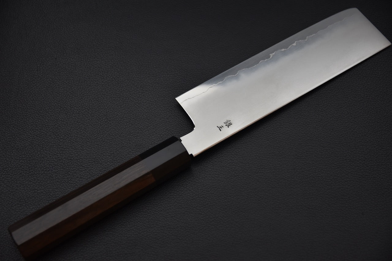 Ce Nakiri de 180mm est forgé par Toru Tamura, l’un des rares forgerons de Kōchi à maîtriser l'acier inoxydable Ginsan (Silver #3). Grâce à la finesse de son travail, ce couteau allie tranchant rasoir, grande précision et entretien simplifié. L’aiguisage final est réalisé par Naohito Myojin, réputé pour ses finitions d’une netteté exceptionnelle.
