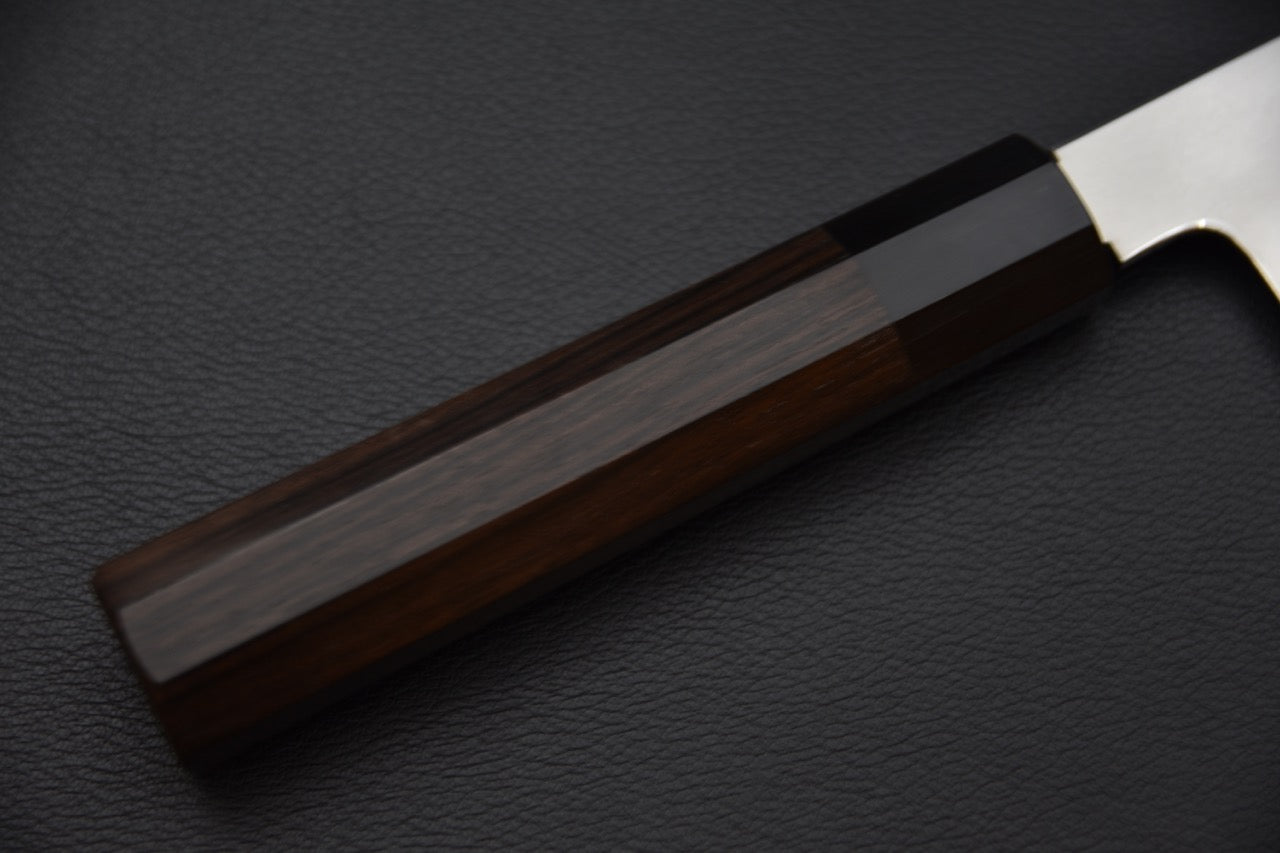 Le manche en ébène de Macassar, fabriqué par Taihei, offre une prise en main luxueuse, dense et bien équilibrée. Le contraste entre la finition Kasumi douce du hagane et la ligne de trempe visible ajoute une touche d’élégance sobre et raffinée.