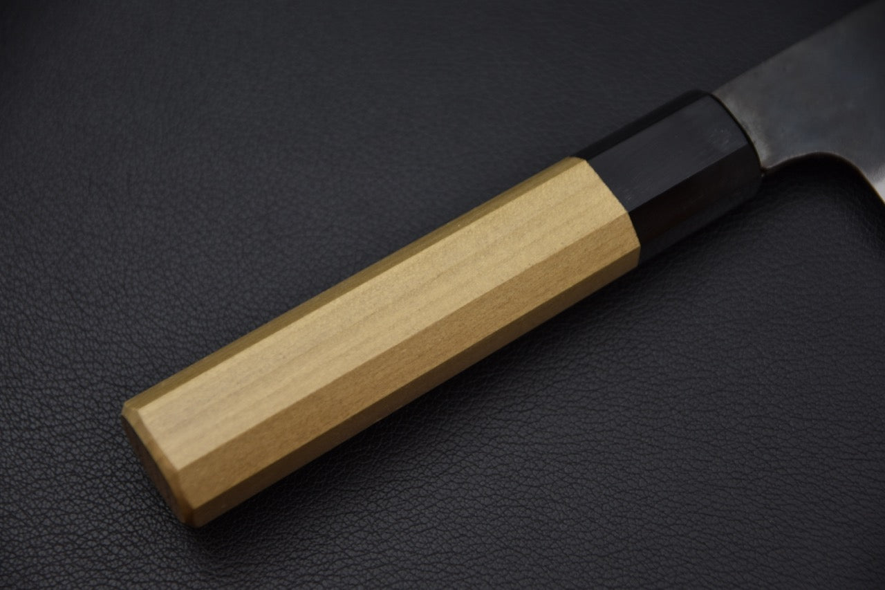 Sa lame sanmai présente un noyau en acier carbone recouvert de couches protectrices de fer doux, avec une finition kurouchi traditionnelle qui confère à la lame un aspect brut tout en la protégeant partiellement contre l’oxydation. Le biseau soigneusement poli révèle la ligne de sanmai, témoignant d’un travail d’émoulage précis.