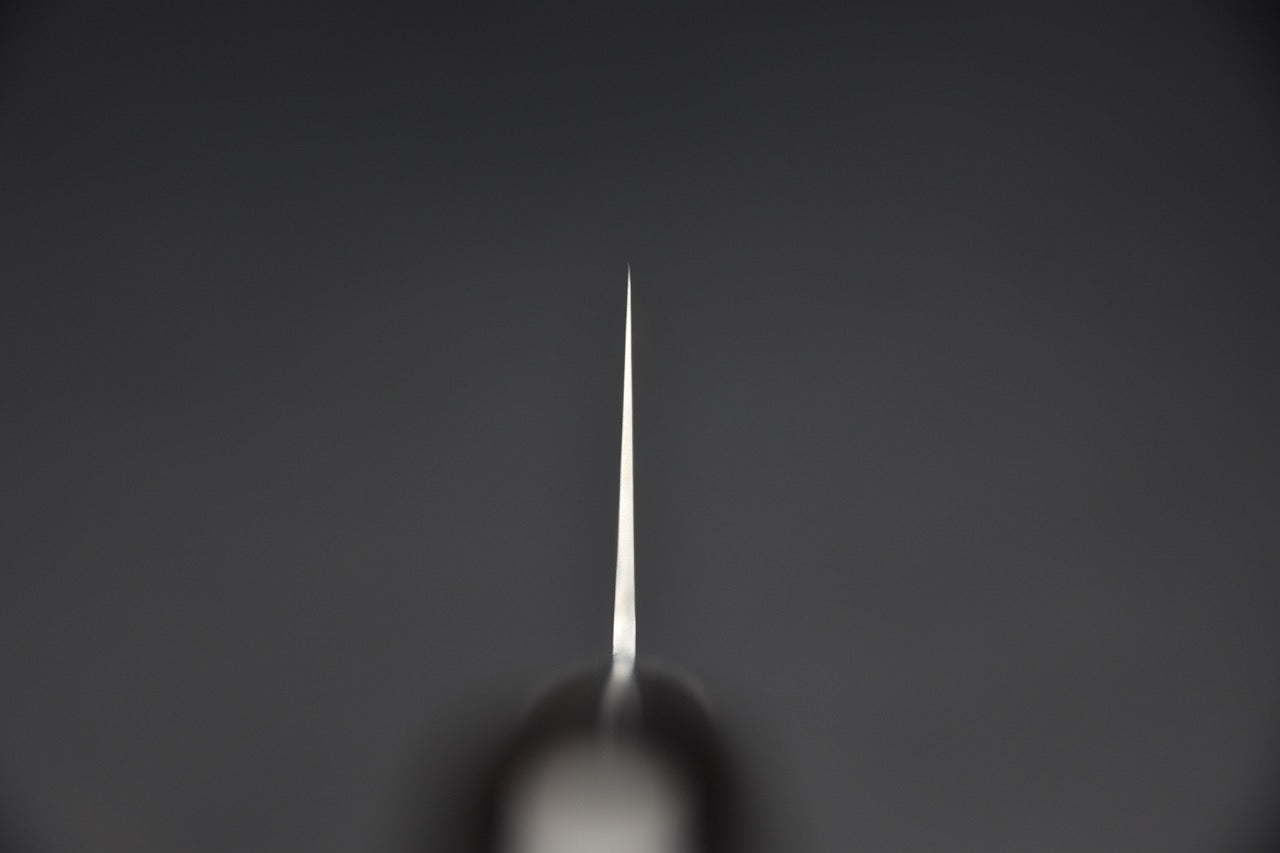 Le manche en bois pakka brun, de style occidental à trois rivets, procure une prise solide et stable. Son poids modéré et son équilibre légèrement orienté vers la lame offrent une sensation familière pour les utilisateurs habitués aux manches occidentaux, tout en conservant la précision propre aux couteaux japonais.