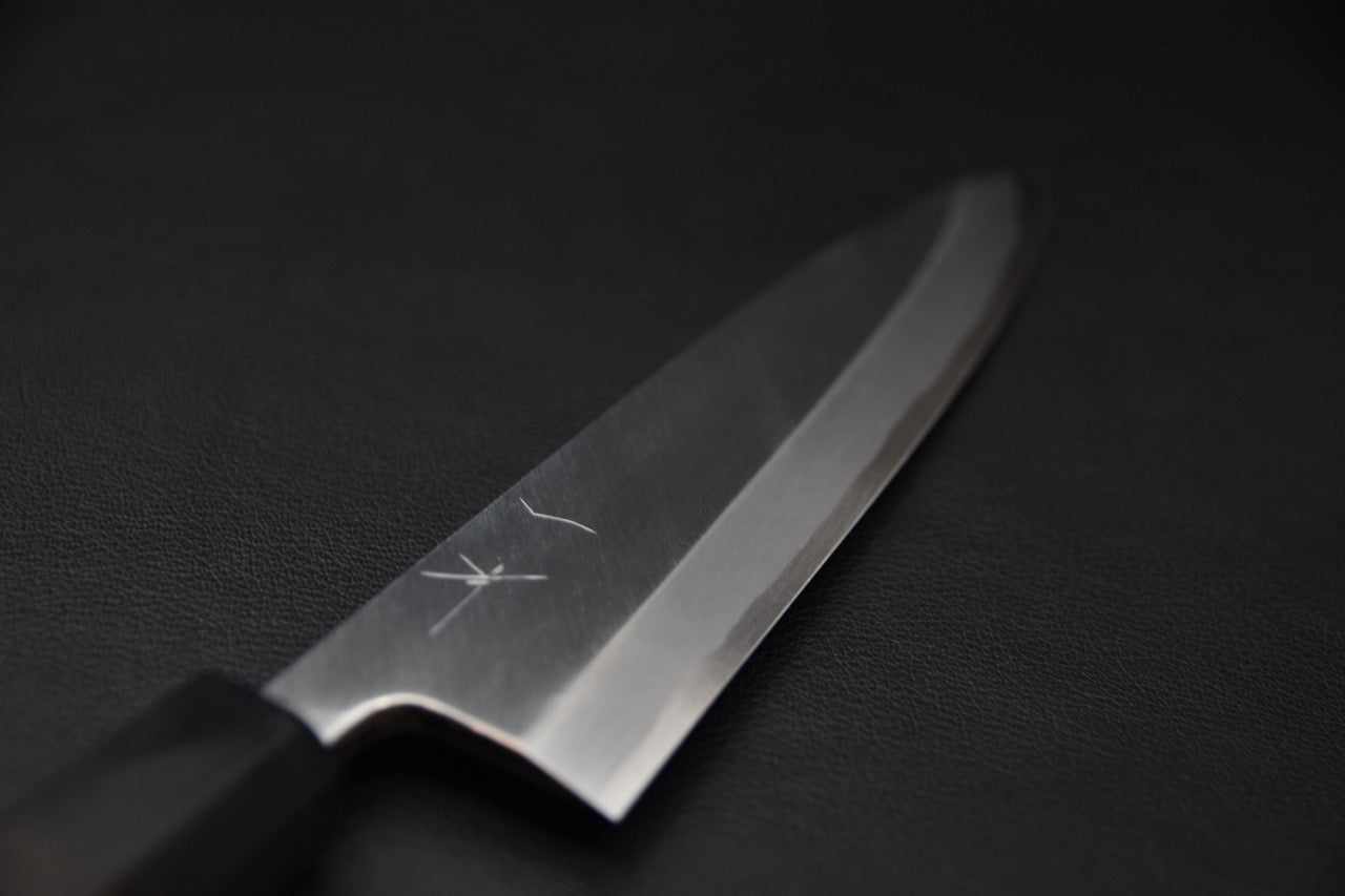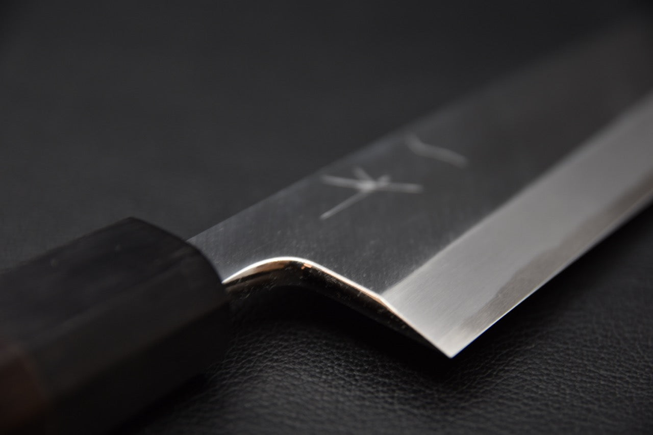 L’Aogami #2 étant un acier carbone, il développera une patine naturelle au contact de l’humidité et des aliments acides. Il est recommandé d’essuyer la lame après usage et d’éviter le lave-vaisselle. Un aiguisage régulier sur pierres à eau permettra de maintenir son plein potentiel de coupe.