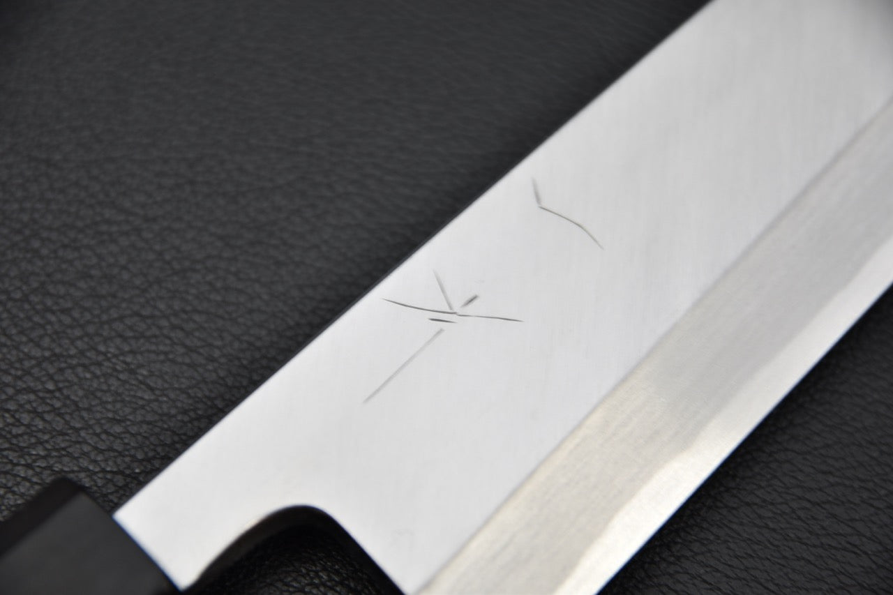 La lame est forgée en Aogami #2 (Blue Steel #2) avec une construction nimai, combinant un noyau en acier carbone dur à un acier doux en revêtement. Cette structure offre un excellent compromis entre tranchant, facilité d’aiguisage et robustesse au niveau du dos. La finition est sobre et traditionnelle, avec une ligne de trempe visible et une géométrie asymétrique adaptée aux droitiers, typique des couteaux japonais de type deba.