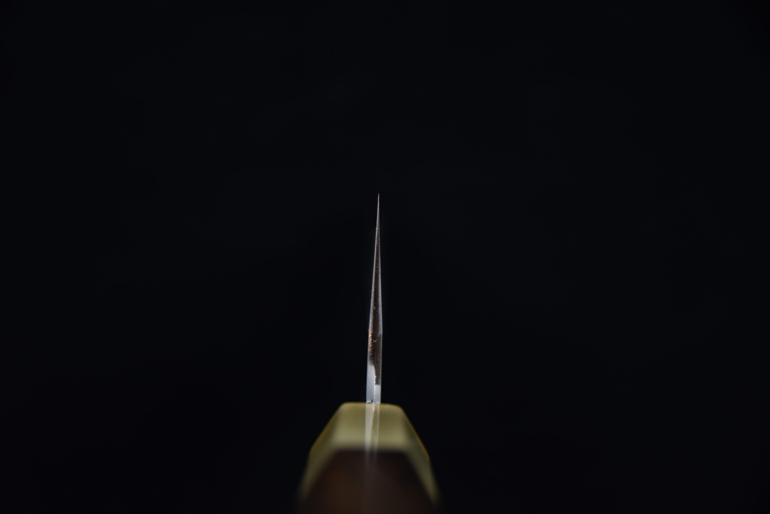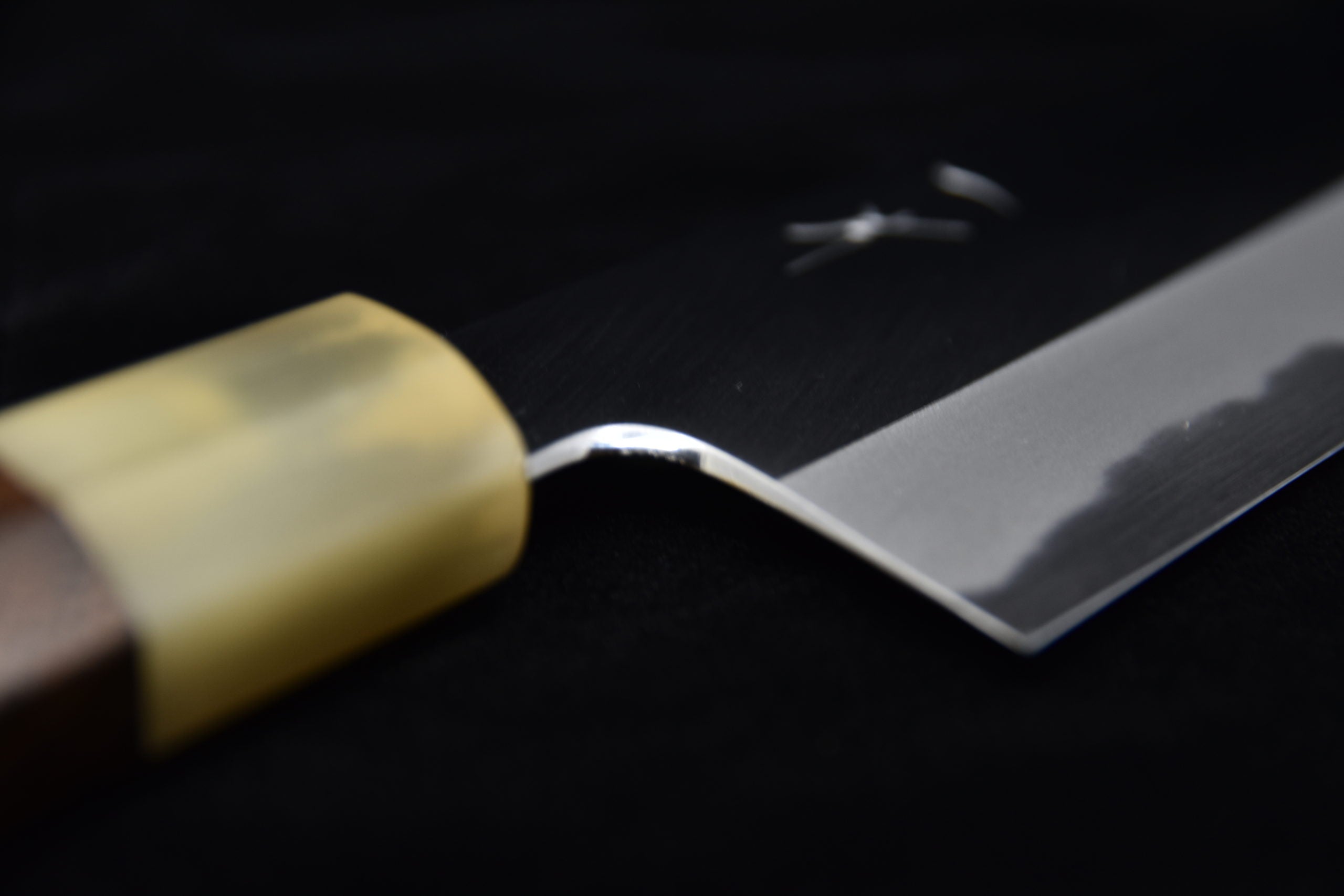 Tanaka Forgeron :Il est fermement résolu à forger des couteaux en acier forgé sans toucher à l'acier inoxydable ou à la cuisson principale. Pour ce qui est de la forge, il s’agit sans aucun doute de la classe supérieure des forgerons. Parce qu'il est fait à la main, vous allez voir une différence nette en termes de produit et de qualité.Kyuzo:Le père de Kyuzo, Heihachi, est l’un des affûteurs les plus occupés de Sakai. La salle d’atelier et le couloir de Heihachi étaient toujours remplis de couteaux attendant d’être affûtés. Bien que Kyuzo ait d'abord travaillé sous la direction de son père pour apprendre les bases de l'affûtage grossier, il est finalement devenu un élève de Kambei, connu comme l'un des meilleurs aiguiseurs de Sakai parce qu'il savait le mieux comment aiguiser de larges couteaux à double biseau. Après quelques années de formation, il a développé son style basé sur ces maîtres respectifs, son père et Kambei. Aujourd'hui, Kyuzo est l'une des rares personnes à pouvoir affûter un double biseau large avec une très bonne ligne Shinogi dans Sakai, l'une des techniques les plus difficiles d'affûtage.