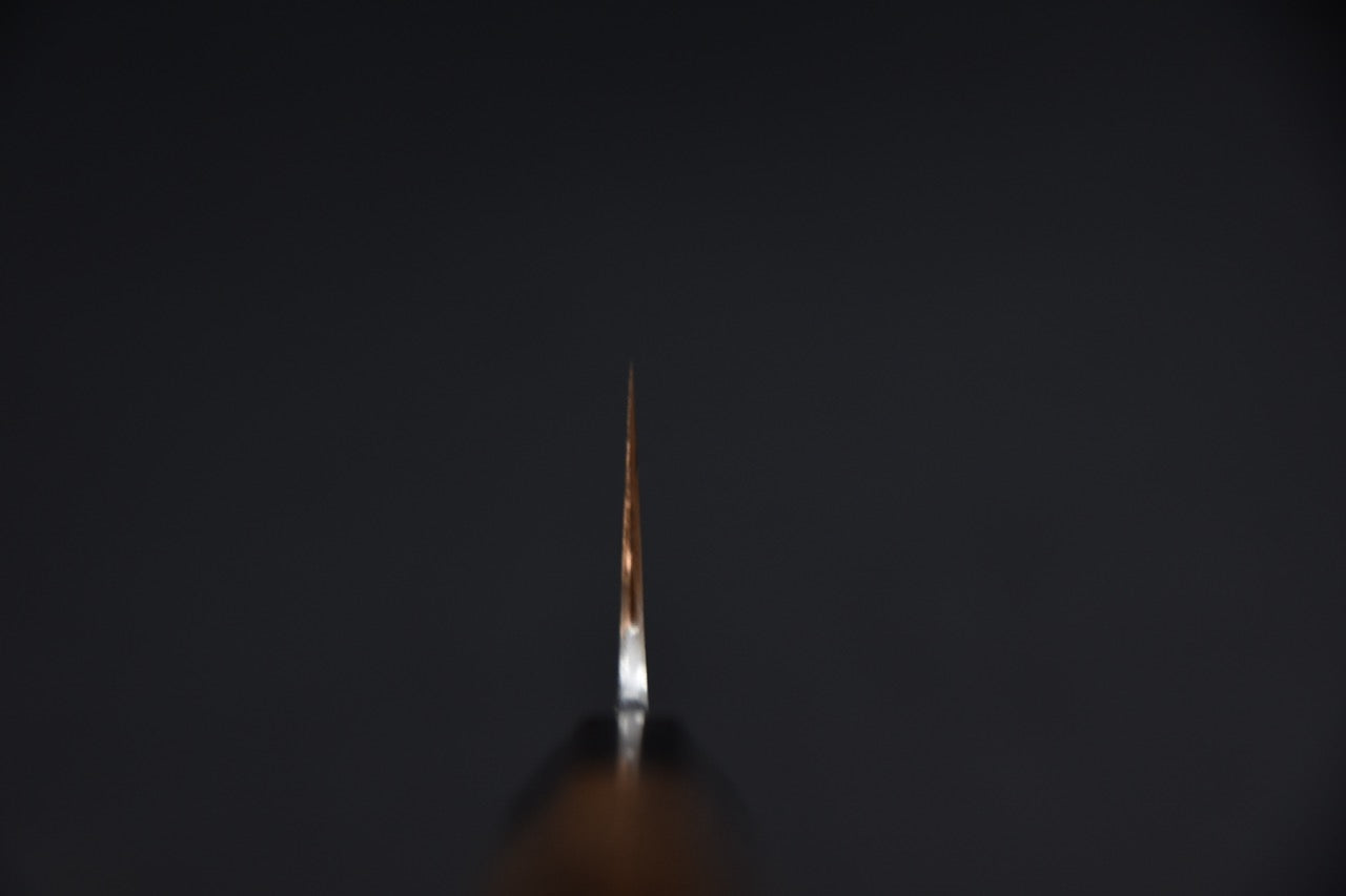 La lame est en Shirogami #1 avec un habillage en fer doux, soit une construction en 3 couches : noyau acier carbone dur et couches extérieures plus douces. Ce type de construction favorise une prise de tranchant fine et une sensation de coupe directe. Le couteau présente une géométrie mince pour sa longueur, avec une épaisseur indiquée à 2,7mm, ce qui va dans le sens d’un travail précis sur les fruits, légumes, herbes, petits poissons, parage des protéines et tâches de préparation où l’on veut plus de portée qu’avec un petty de 120 à 150mm.