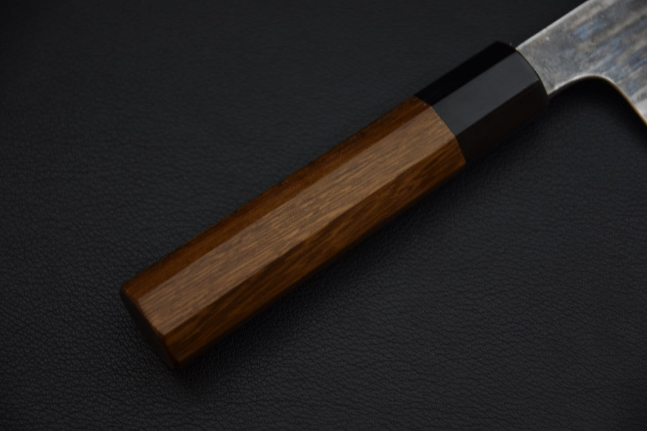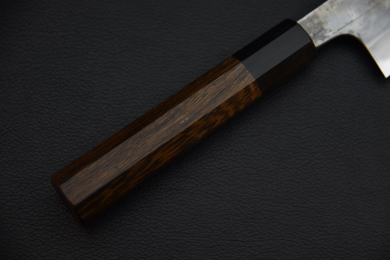 L’acier Shirogami #1 est apprécié pour sa facilité d’aiguisage et son tranchant très fin, mais il demande un entretien attentif. La lame n’est pas inoxydable : il faut l’essuyer rapidement après usage, éviter de la laisser humide ou en contact prolongé avec des aliments acides, et accepter le développement progressif d’une patine. Cette patine est normale sur un couteau japonais en acier carbone et fait partie de son évolution à l’usage.