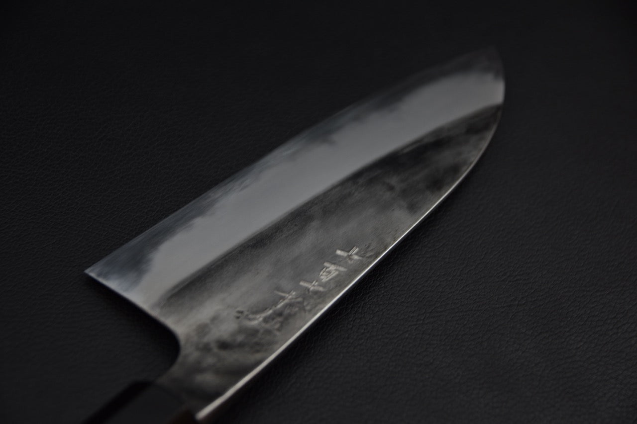 La lame de 165 mm présente ici une finition sobre et artisanale, avec un contraste visible entre le jigane et la zone de coupe polie. Le profil santoku offre une bonne hauteur de lame et une pointe pratique pour les travaux de précision, tout en conservant une géométrie adaptée aux coupes poussées, tirées et aux mouvements de hachage contrôlé. Le manche wa octogonal par Taihei en bois de Tagayasan, avec ferrule noire, apporte une prise en main ferme et un équilibre typique des couteaux japonais à manche traditionnel.