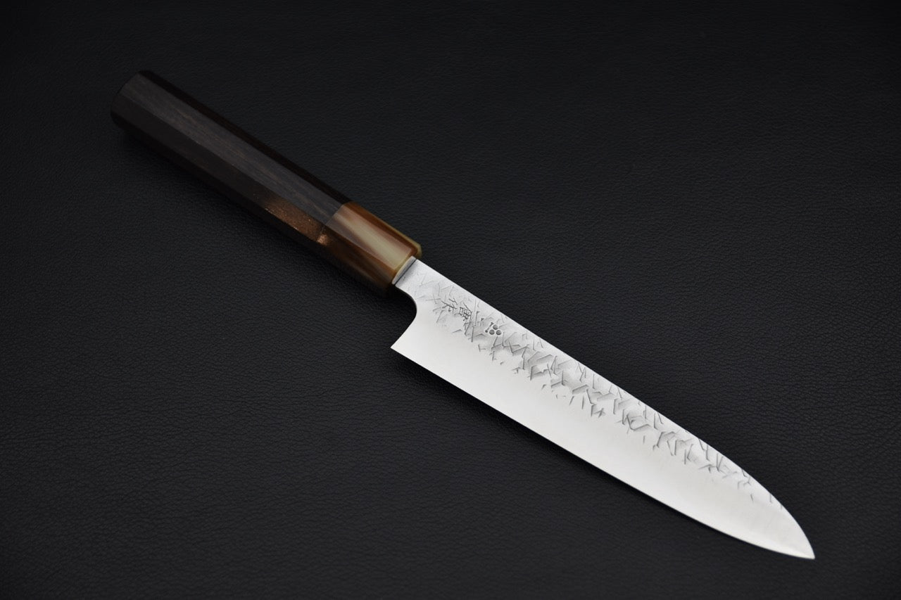 La lame présente une finition tsuchime caractéristique, avec un motif martelé anguleux qui apporte à la fois une signature visuelle distinctive et un effet anti-adhérence lors de la coupe. La surface polie met en valeur les textures du martelage, tandis que le profil mince et précis du petty permet un travail contrôlé sur les petites pièces.