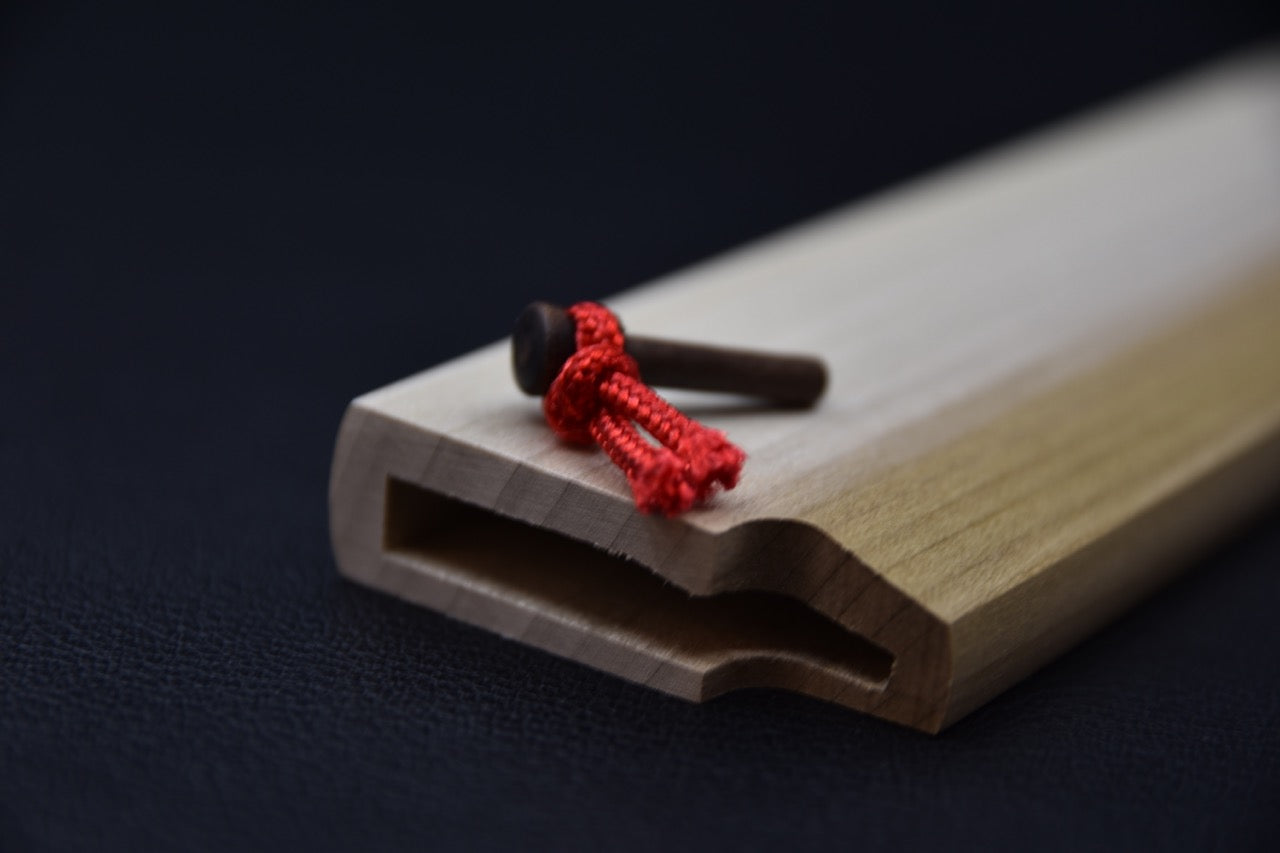 Ce saya, est conçu pour un couteau japonais Kiritsuke Yanagiba de 270 mm. Elle est fabriquée en bois de magnolia, un bois léger et traditionnel pour les étuis de couteaux japonais.