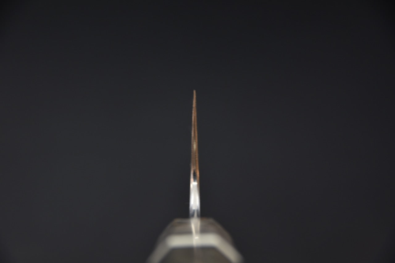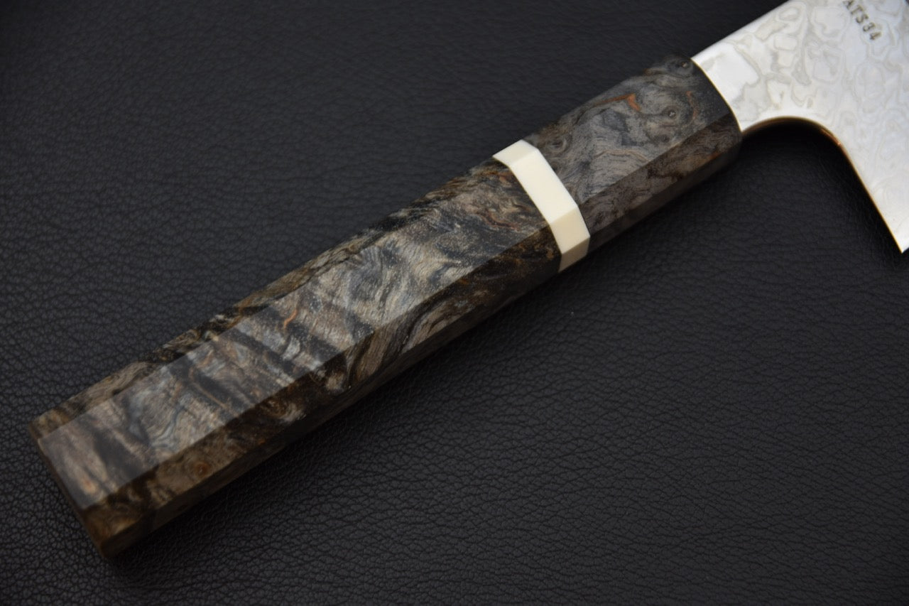 Le manche japonais (wa) est réalisé en bois de bouleau stabilisé, avec une mitre claire apportant un contraste sobre et moderne. Sa forme octogonale assure une prise en main naturelle et sécurisante, aussi bien pour les droitiers que pour les gauchers. L’équilibre général du couteau est légèrement orienté vers la lame, ce qui renforce le contrôle lors de la coupe.