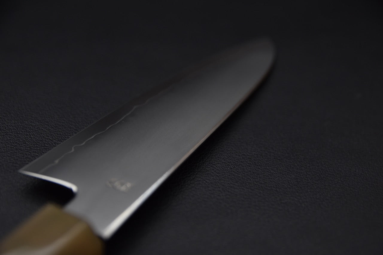 Ce couteau Gyuto de 180mm, signé Hitohira issue de l'atelier de Naohito Myojin, est une pièce de précision rare pour les passionnés de cuisine. Sa lame en acier SG2, un acier inoxydable à poudre ultra-performant, garantit un tranchant remarquable et une excellente tenue de coupe. Le contraste visuel du kasumi — cette finition brumeuse révélant la ligne de trempe ondulée — accentue l’élégance de la lame tout en témoignant du soin artisanal porté à chaque détail.