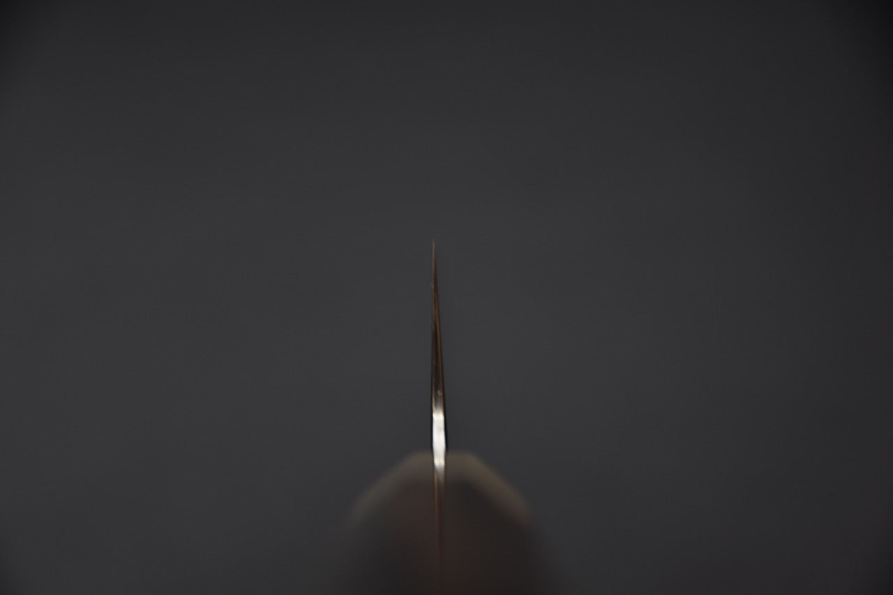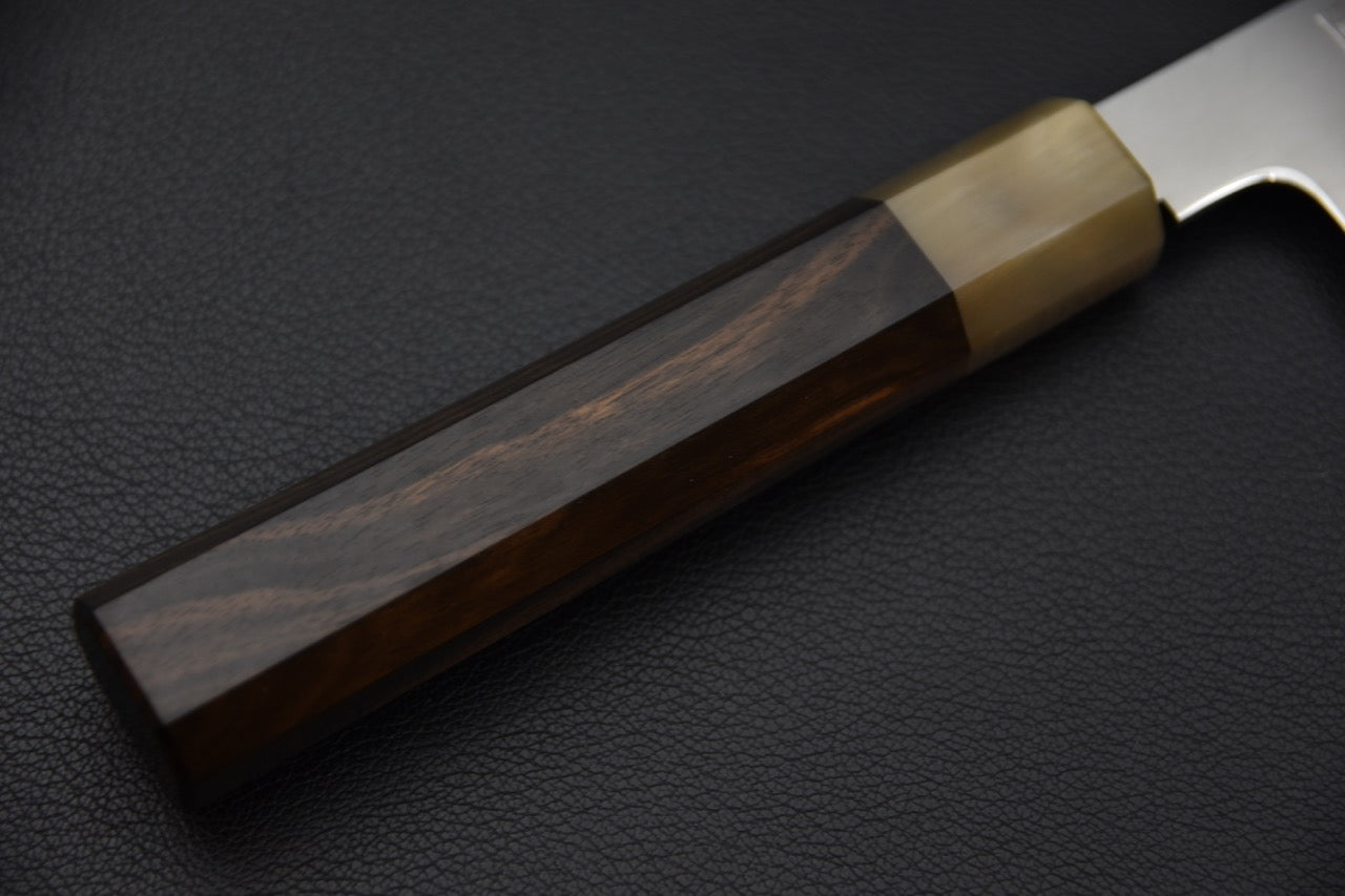 Le manche en ébène, dense et sombre, offre un équilibre naturel et une prise en main stable. Sa bague en corne de buffle renforce non seulement l’esthétique, mais assure également une transition fluide entre lame et manche. Ce Gyuto est un choix polyvalent pour toutes les coupes du quotidien : viande, poisson, légumes… Son format de 180mm le rend idéal pour ceux qui préfèrent un couteau de chef plus compact, agile et facile à manier.