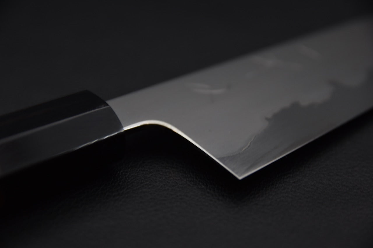 Le mot japonais Gyuto (牛刀) se traduit littéralement par épée à boeuf. Le gyuto est l’équivalent du couteau de chef occidental et est conçu pour tout couper : légumes, viandes et poissons. Il est fait pour être utilisé avec la méthode « push-cut », en soulevant la lame entre chaque mouvement de coupe, ou encore avec la méthode du balancier. Il est important que la lame soit droite au moment de l’impact avec la planche à découper pour éviter les dommages au niveau du tranchant du couteau.