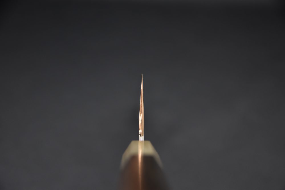 Son père Heihachi, est l’un des affûteurs les plus occupés de Sakai. La salle d’atelier et le couloir de Heihachi étaient toujours remplis de couteaux attendant d’être affûtés. Bien que Kyuzo ait d’abord travaillé sous la direction de son père pour apprendre les bases de l’affûtage grossier, il est finalement devenu un élève de Kambei, connu comme l’un des meilleurs aiguiseurs de Sakai parce qu’il savait le mieux comment aiguiser de larges couteaux à double biseau. Après quelques années de formation, il a développé son style basé sur ces maîtres respectifs, son père et Kambei. Aujourd’hui, Kyuzo est l’une des rares personnes à pouvoir affûter un double biseau large avec une très bonne ligne Shinogi dans Sakai, l’une des techniques les plus difficiles d’affûtage.