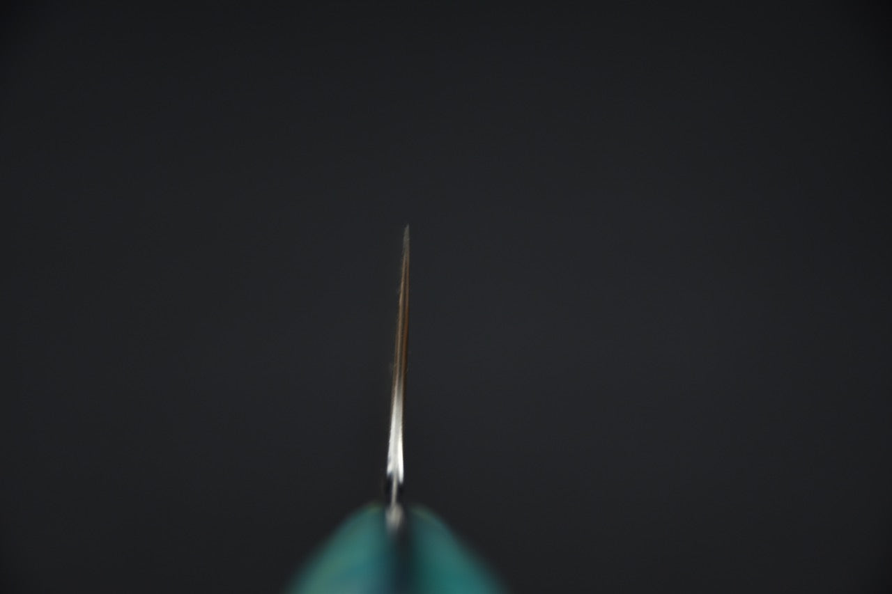Le Kiritsuke Gyuto est un croisement entre le kiritsuke traditionnel et le gyuto. Le profil du tranchant, généralement plus droit, et sa pointe coupée s’apparentent au kiritsuke alors que son double biseau est caractéristique du gyuto. Le Kiritsuke Gyuto fait office de couteau de chef dans votre cuisine et peut effectuer la majorité des tâches. On se retrouve habituellement entre 210 et 270 mm.