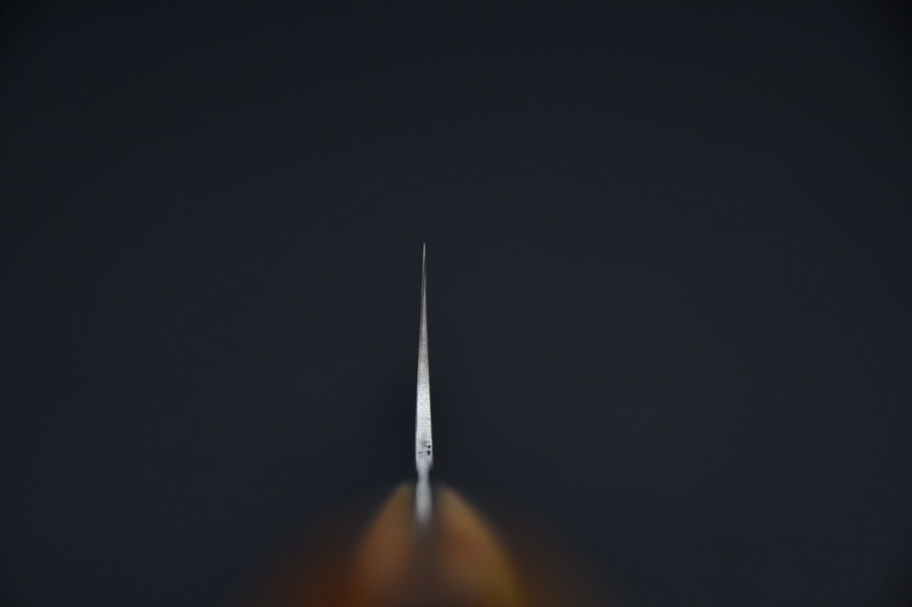 Pour prolonger la durée de vie du Gyuto et maintenir son tranchant, nous recommandons de l’affûter régulièrement avec un fusil en céramique de qualité ou en utilisant le bloc de cuir. Pour ce qui est de l'aiguisage sur pierre, nous recommandons de le faire une ou deux fois par années pour une utilisation non professionnelle. L’aiguisage sur pierre doit être fait avec soin et précision, en respectant l'angle de la lame et en suivant les techniques appropriées. Si vous voulez, on s’en occupe via notre service d’aiguisage expert. Si votre Gyuto est fabriqué à partir d’acier oxydable, il est essentiel de prendre soin de nettoyer et de sécher correctement la lame après chaque utilisation, afin de prévenir la formation de rouille et d'autres dommages liés à l'humidité. Dans le cas où votre couteau est fait d’acier inoxydable, on vous conseille tout de même de prendre soin de celui-ci et de ne pas le mettre au lave-vaisselle par exemple.