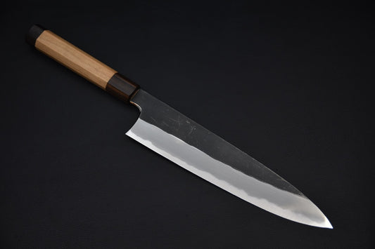 Pour prolonger la durée de vie du Gyuto et maintenir son tranchant, nous recommandons de l’affûter régulièrement avec un fusil en céramique de qualité ou en utilisant le bloc de cuir. Pour ce qui est de l'aiguisage sur pierre, nous recommandons de le faire une ou deux fois par années pour une utilisation non professionnelle. L’aiguisage sur pierre doit être fait avec soin et précision, en respectant l'angle de la lame et en suivant les techniques appropriées. Si vous voulez, on s’en occupe via notre service d’aiguisage expert. Si votre Gyuto est fabriqué à partir d’acier oxydable, il est essentiel de prendre soin de nettoyer et de sécher correctement la lame après chaque utilisation, afin de prévenir la formation de rouille et d'autres dommages liés à l'humidité. Dans le cas où votre couteau est fait d’acier inoxydable, on vous conseille tout de même de prendre soin de celui-ci et de ne pas le mettre au lave-vaisselle par exemple.