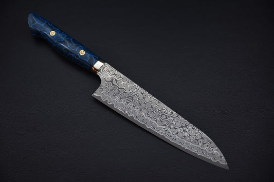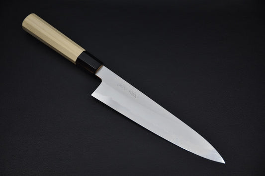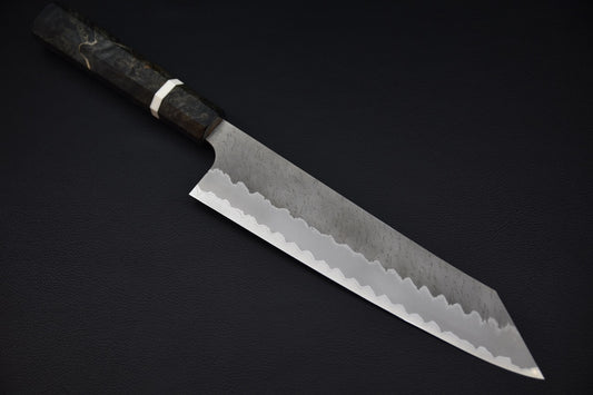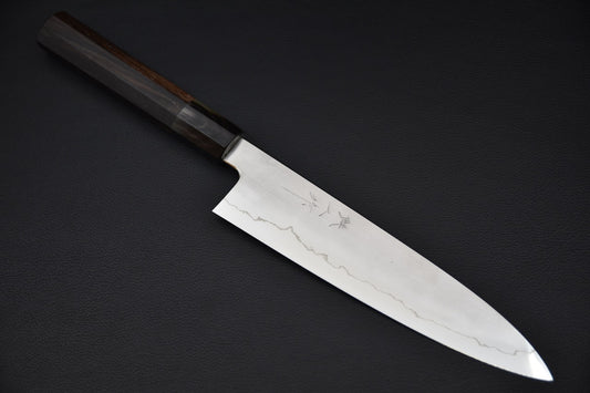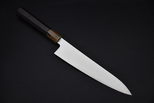 Le Gyuto, également connu sous le nom de 牛刀 en japonais, est un couteau polyvalent qui se traduit littéralement par (épée à bœuf). Il est considéré comme l'équivalent du couteau de chef occidental et est spécialement conçu pour accomplir toutes sortes de tâches de coupe, que ce soit pour les légumes, les viandes ou les poissons. Doté d'une lame tranchante et d'une construction solide, le Gyuto est un outil indispensable pour tout cuisinier professionnel ou amateur soucieux de la précision et de la qualité de ses coupes.