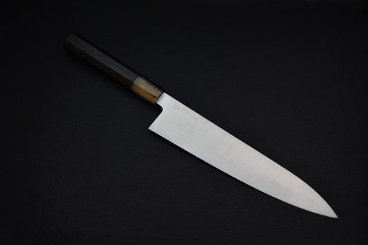 Pour prolonger la durée de vie du Gyuto et maintenir son tranchant, nous recommandons de l’affûter régulièrement avec un fusil en céramique de qualité ou en utilisant le bloc de cuir. Pour ce qui est de l'aiguisage sur pierre, nous recommandons de le faire une ou deux fois par années pour une utilisation non professionnelle. L’aiguisage sur pierre doit être fait avec soin et précision, en respectant l'angle de la lame et en suivant les techniques appropriées. Si vous voulez, on s’en occupe via notre service d’aiguisage expert. Si votre Gyuto est fabriqué à partir d’acier oxydable, il est essentiel de prendre soin de nettoyer et de sécher correctement la lame après chaque utilisation, afin de prévenir la formation de rouille et d'autres dommages liés à l'humidité. Dans le cas où votre couteau est fait d’acier inoxydable, on vous conseille tout de même de prendre soin de celui-ci et de ne pas le mettre au lave-vaisselle par exemple.