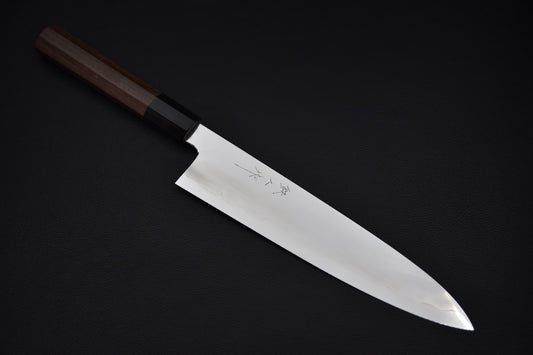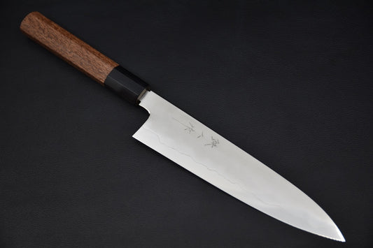 Le Gyuto, également connu sous le nom de 牛刀 en japonais, est un couteau polyvalent qui se traduit littéralement par (épée à bœuf). Il est considéré comme l'équivalent du couteau de chef occidental et est spécialement conçu pour accomplir toutes sortes de tâches de coupe, que ce soit pour les légumes, les viandes ou les poissons. Doté d'une lame tranchante et d'une construction solide, le Gyuto est un outil indispensable pour tout cuisinier professionnel ou amateur soucieux de la précision et de la qualité de ses coupes.