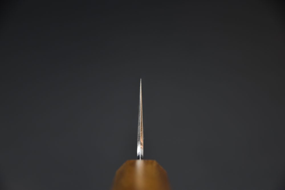 La série de couteaux japonais d’Hado Junpaku est forgée à la main à partir Shirogami 1(acier blanc numéro 1) par Yoshikazu Tanaka pour ensuite, être émoulez par Tadataka Maruyama de Fukui Co & Ltd. En construction san mai (3 couches d’acier superposées), chaque couteau de la série est recouvert d’acier inoxydable souple, ce qui leur confère une facilité d’entretien minime tout en gardant les avantages de l’acier carbone puisque seulement l’acier carbone découvert au bas de la lame devra bénéficier d’un entretien plus assidu de la part de son utilisateur. Historiquement, Tanaka ne forgeait que des couteaux d’acier carbone revêtu de fer doux oxydable, c’est donc après près d’un demi-siècle de forge qu’il ajoute une corde de plus à son arc en forgeant des couteaux recouverts d’acier inoxydable.Nous recommandons cette série de couteaux aux cuisiniers professionnels, aux personnes voulant faire leur premier pas dans l’univers du couteau japonais traditionnel en acier carbone oxydable ou encore, à tous ceux qui veulent découvrir le résultat de cette nouvelle collaboration.