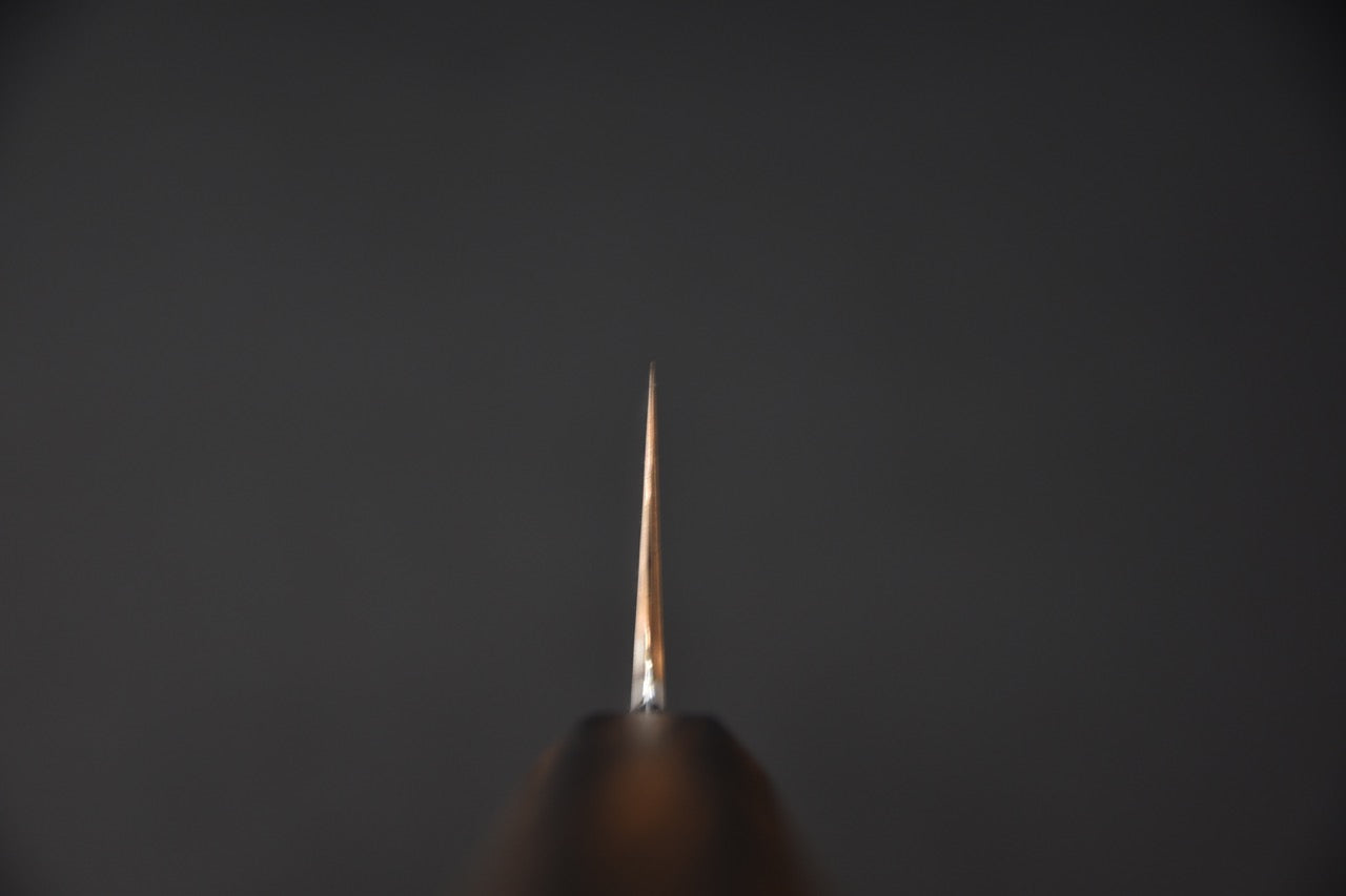 Ce Santoku japonais incarne l’équilibre parfait entre tradition et performance moderne. Forgé à partir d’un acier carbone Shirogami #1, réputé pour sa finesse de coupe, il est protégé par une couche d’acier inoxydable qui limite l’entretien tout en préservant la puissance de coupe caractéristique des lames en carbone. Le résultat : une lame fine et réactive qui glisse sans effort dans les légumes, les viandes et le poisson.