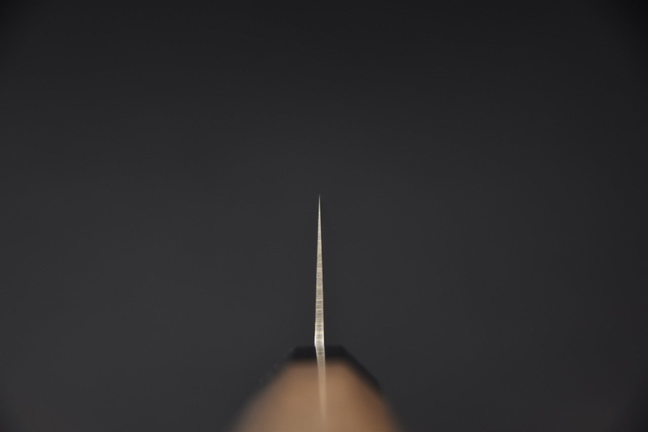 La lame fine et tranchante présente un profil de Gyuto, équivalent japonais du couteau de chef occidental, idéal pour la coupe de viandes, poissons et légumes.