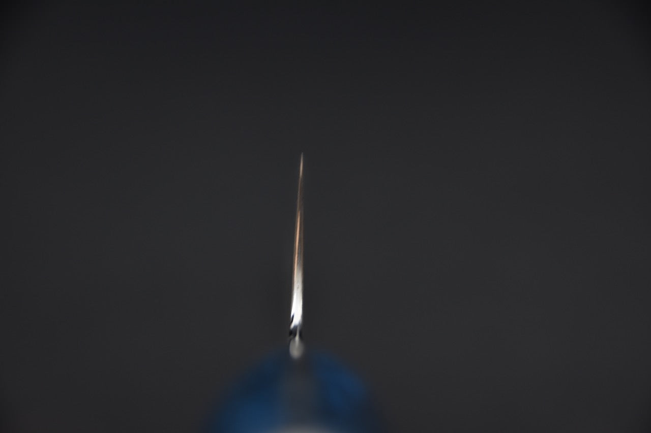 Pour prolonger la durée de vie du Gyuto et maintenir son tranchant, nous recommandons de l’affûter régulièrement avec un fusil en céramique de qualité ou en utilisant le bloc de cuir. Pour ce qui est de l'aiguisage sur pierre, nous recommandons de le faire une ou deux fois par années pour une utilisation non professionnelle. L’aiguisage sur pierre doit être fait avec soin et précision, en respectant l'angle de la lame et en suivant les techniques appropriées. Si vous voulez, on s’en occupe via notre service d’aiguisage expert. Si votre Gyuto est fabriqué à partir d’acier oxydable, il est essentiel de prendre soin de nettoyer et de sécher correctement la lame après chaque utilisation, afin de prévenir la formation de rouille et d'autres dommages liés à l'humidité. Dans le cas où votre couteau est fait d’acier inoxydable, on vous conseille tout de même de prendre soin de celui-ci et de ne pas le mettre au lave-vaisselle par exemple.