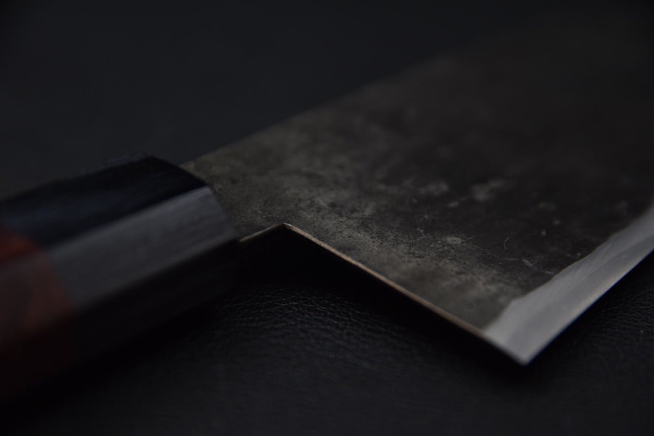Le couteau Santoku, ou encore Santoku bōchō, est un couteau japonais Santoku polyvalent d'origine japonaise. Son nom signifie littéralement "trois vertus" ou "trois utilisations" en japonais. Mesurant généralement entre 15 et 18 cm de long (6 et 7 pouces), sa lame possède un tranchant plat et une pointe incurvée en kamagata formant un angle d'environ 60 degrés. Le terme "Santoku" fait référence à la grande variété d'ingrédients que ce couteau Santoku peut couper, tels que la viande, le poisson et les légumes, ainsi qu'aux tâches qu'il peut accomplir, comme tranchée, hacher et émincer. Ces deux interprétations soulignent l'aspect multi-usage et polyvalent de ce couteau japonais Santoku de cuisine.