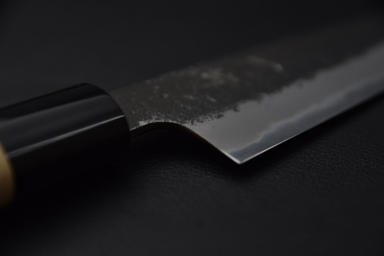 Shirogami #2 se traduit par : Shiro (blanc) et Gami (Acier) et donc; acier blanc #2. Il est nommé ainsi à cause de la couleur de l’emballage dans lequel il était enveloppé à Hitachi Metals. La composition de cet acier est très pure et contient presque seulement du fer et du carbone (1.05%-1.2%). C’est entre les mains de forgerons très expérimentés qu’on se rend compte du potentiel énorme du Shirogami #2. La qualité du traitement thermique et le forgeage à plus basse température sont des éléments clés pouvant permettre au Shirogami #2 de rivaliser, et même de surpasser beaucoup d’aciers modernes. Essayer une lame en Shiro #2 forgée par Tanaka-san, Kisuke Manaka-san ou la forge de Yoshikane et vous verrez !