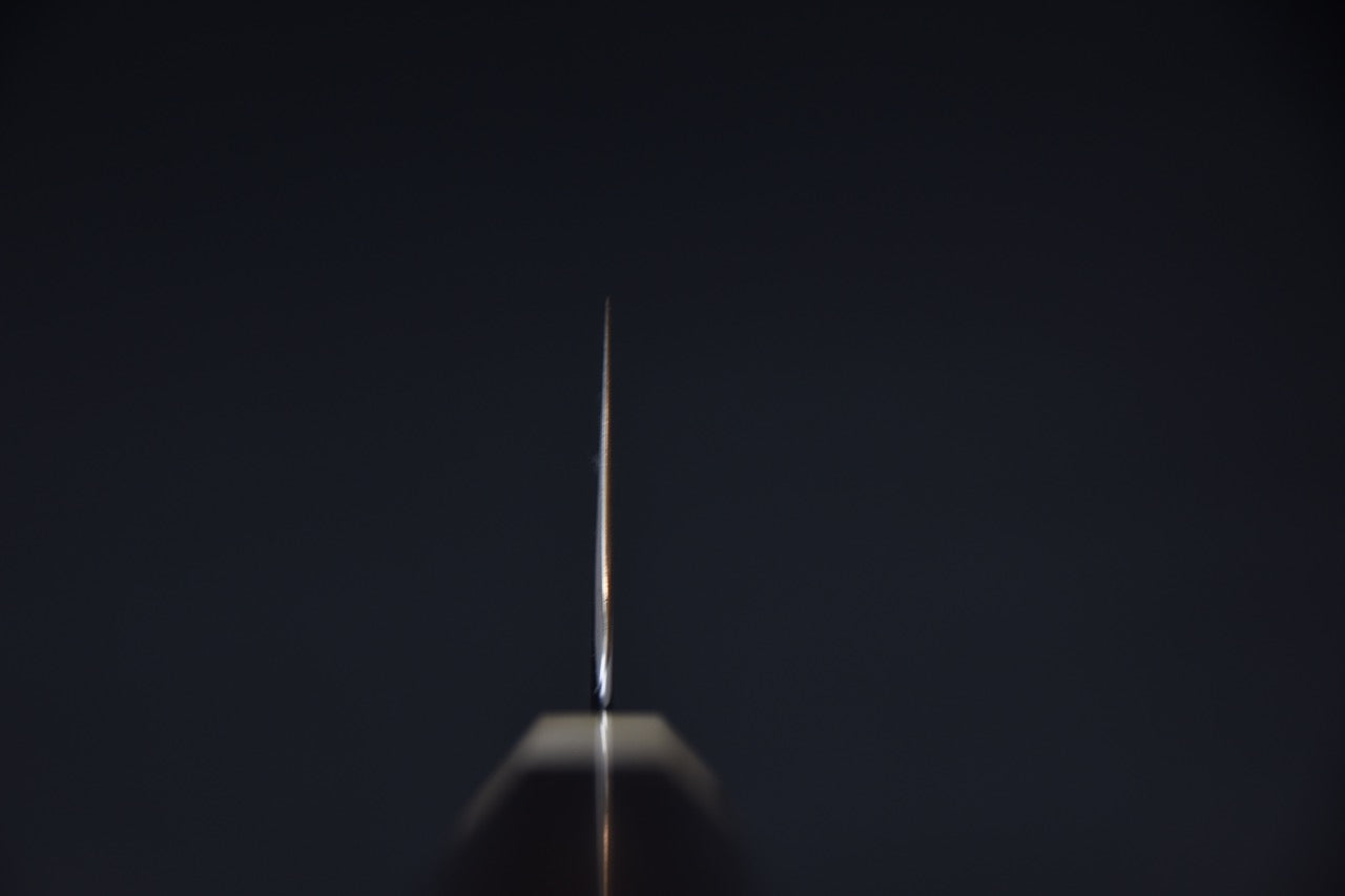 Le Shirogami #1 par Hitachi steel co se traduit par acier blanc #1 et est une version améliorée du Shirogami #2 car il contient un taux de carbone plus élevé. Il tient sa dénomination en référence à la couleur du papier dans lequel il est emballé une fois produit. Il est considéré comme un des aciers les plus purs, après le Tamahagane, ce qui permet d’obtenir un tranchant plus incisif que la plupart des autres aciers. Cependant, il sera généralement plus fragile et peut briser plus facilement par suite d’une mauvaise utilisation. Maîtriser la forge du shirogami #1 pour exploiter son plein potentiel n’est pas simple et demande une expertise que peu de forgerons détiennent. C’est dans le processus de fabrication d’un couteau de type Mizu Honyaki que vous retrouverez le shirogami #1 sous sa version la plus difficile a forgée, mais aussi la plus tranchante.