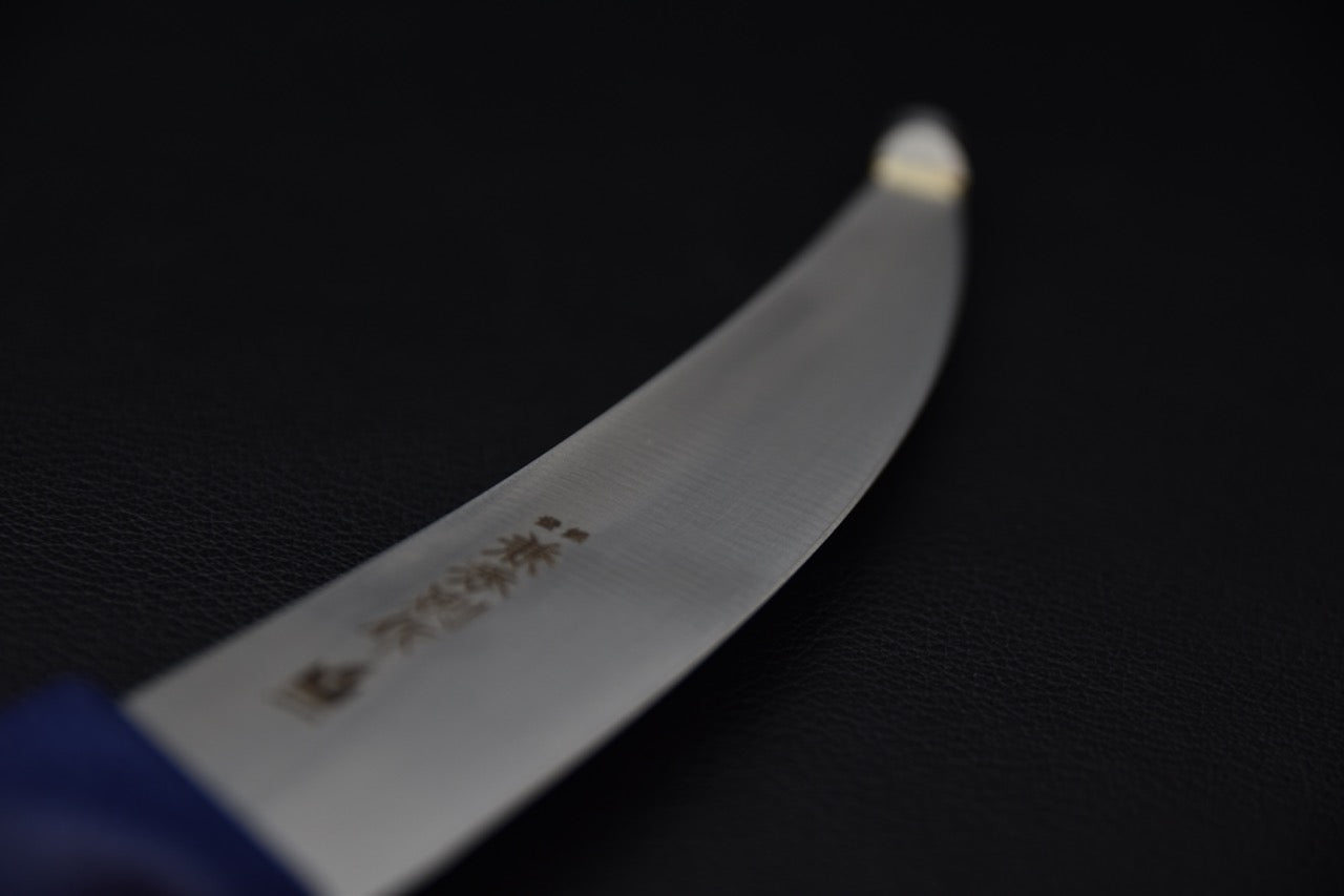 Ce couteau japonais Kanehide Bessaku Chosaki est spécialement conçu pour le travail précis du poisson. Sa lame fine et courbée permet de suivre la forme des os avec une grande aisance, rendant la découpe plus fluide et sécurisée. Le bout arrondi, renforcé par une pièce métallique, apporte une sécurité supplémentaire en évitant les perforations accidentelles.