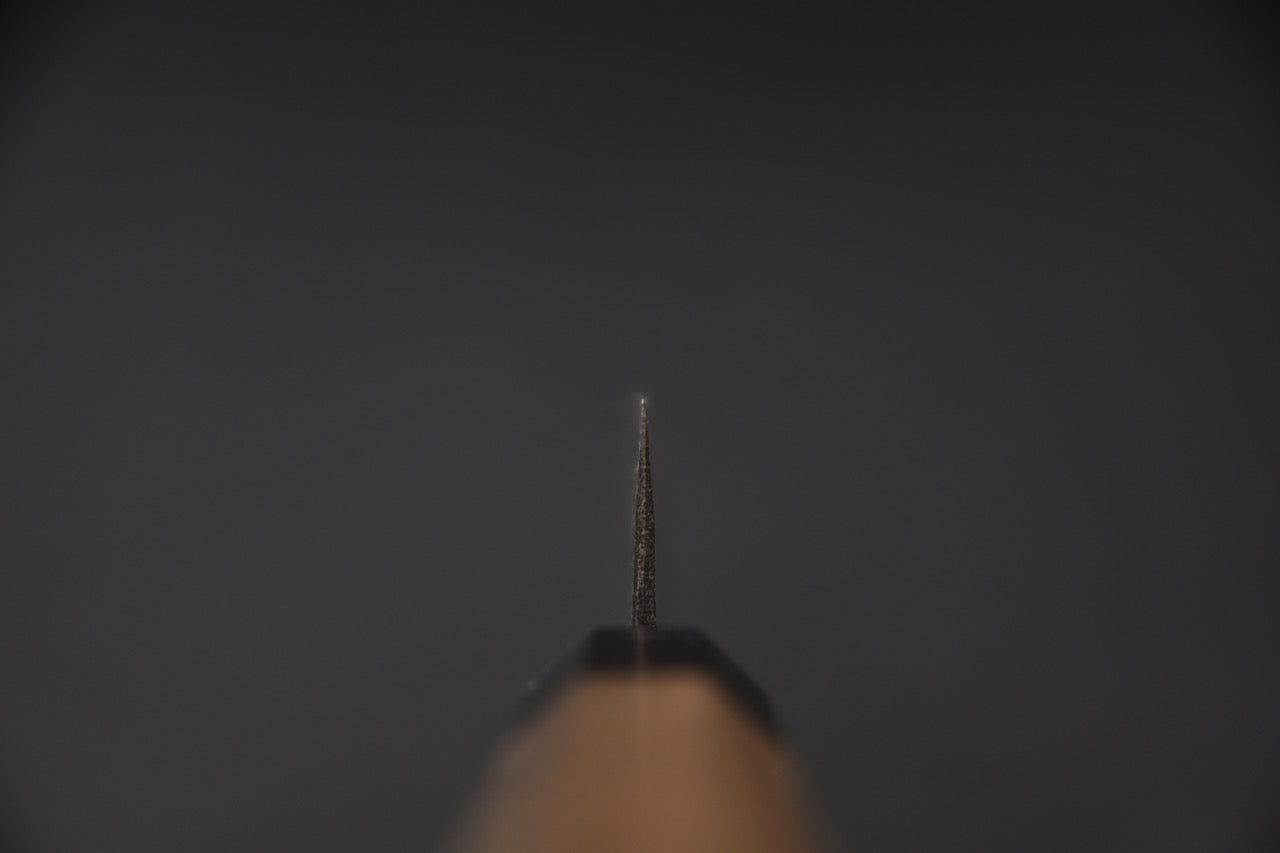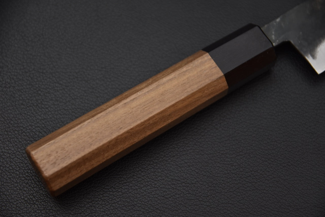 Ce couteau Sujihiki de 24 cm, au profil long et élancé, glisse avec une aisance naturelle à travers viandes fines et poissons délicats, pour des tranches nettes sans effort. Sa finition Kurouchi, volontairement rugueuse, évoque l’artisanat traditionnel et développe une patine subtile au fil des usages, donnant à chaque tranche une touche d’authenticité. L’acier Aogami #1, réputé pour sa dureté et son tranchant durable, procure une précision remarquable.