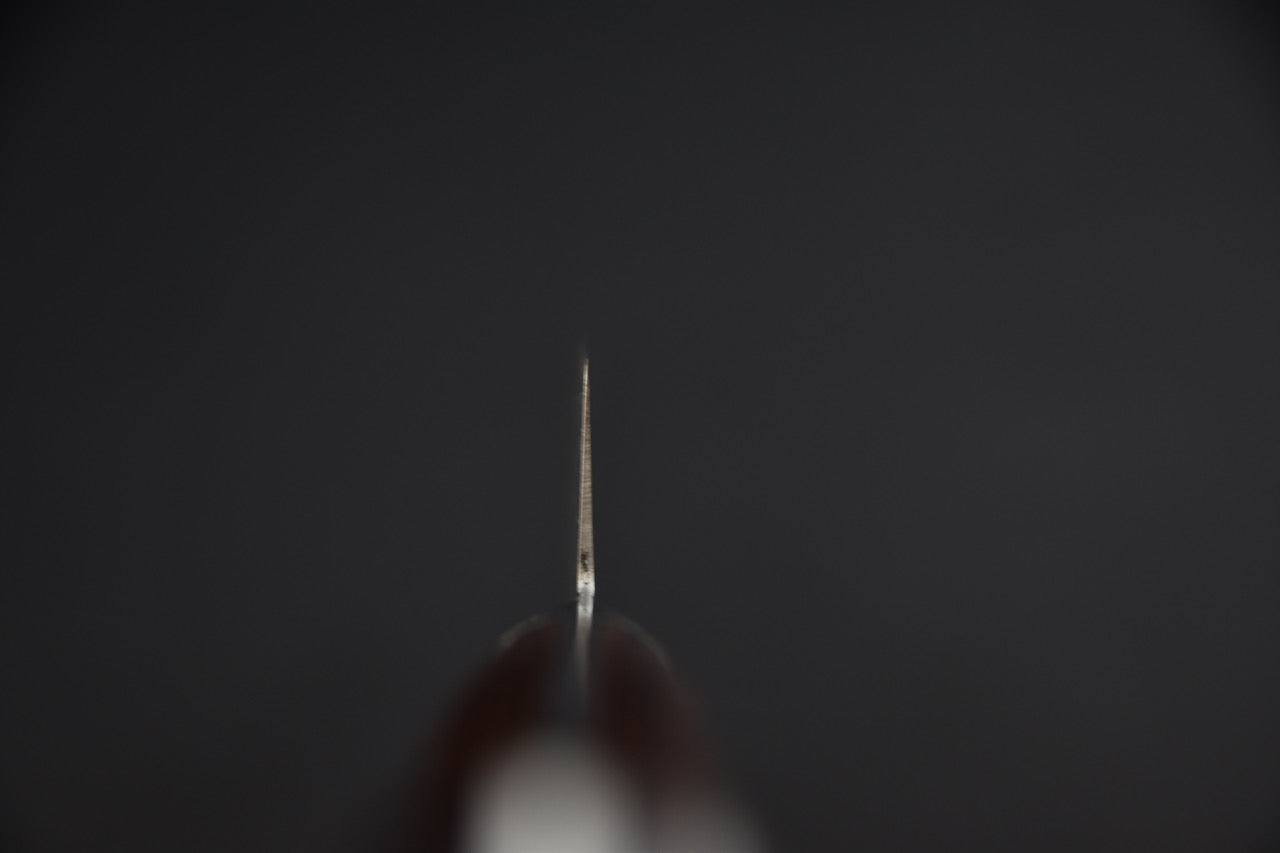 Sujihiki se traduit par « trancheur de chair », ce qui décrit bien son rôle. Généralement longue de 240 mm à 300 mm et d’une hauteur de 34 mm à 40 mm, la lame du sujihiki est parfaite pour effectuer de longs mouvements de coupe, du talon à la pointe. Une hauteur de lame moindre diminue la friction au moment de la coupe et garde les fibres des protéines que vous coupez le plus intactes possible.