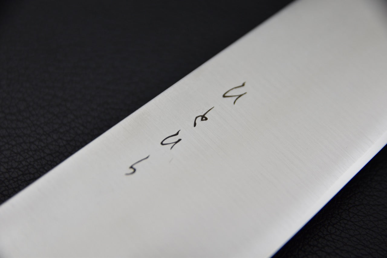 Le couteau Sujihiki se caractérise par son double tranchant, ce qui le rend accessible aux gauchers et aux droitiers. Il possède une lame longue et étroite avec un bout pointu, généralement d'une longueur de 240 à 300 mm et d'une hauteur de 30 à 40 mm.