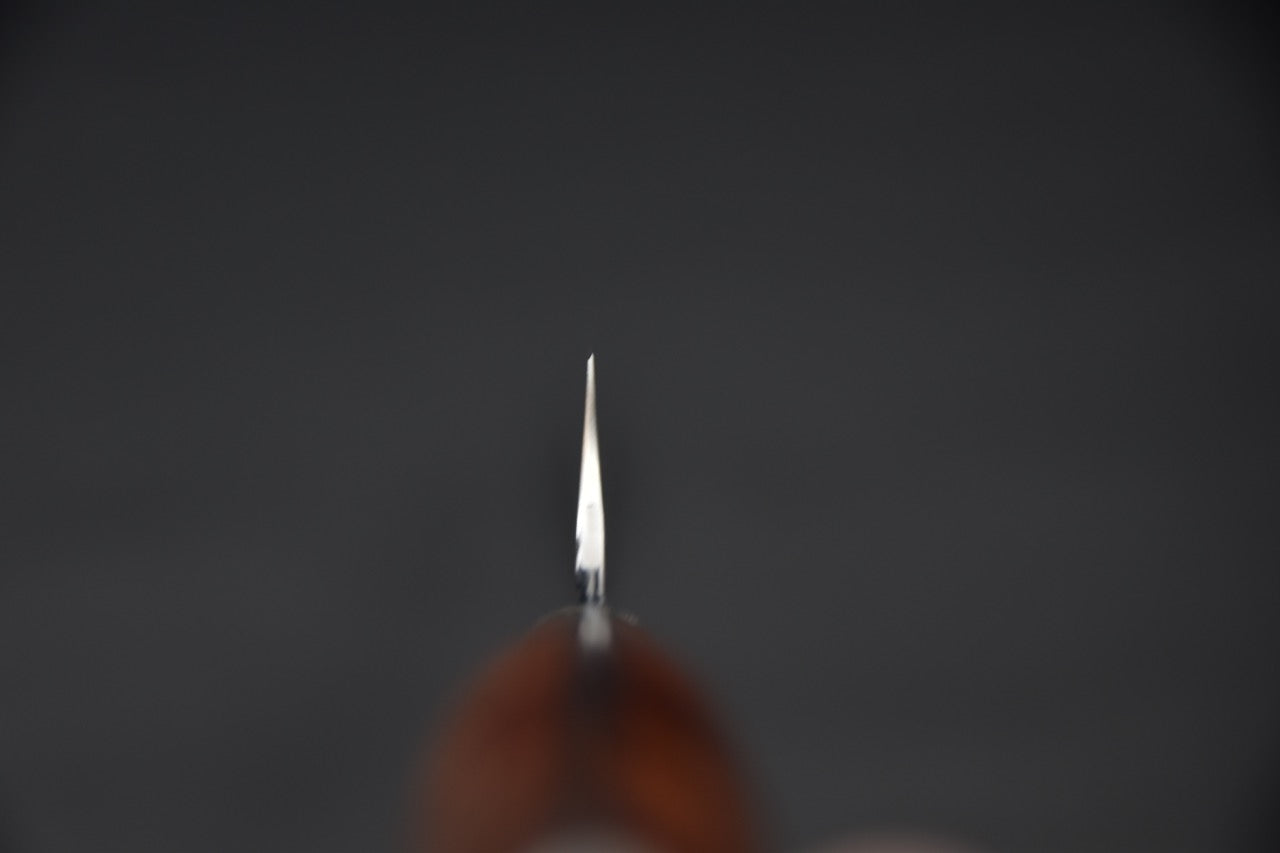 Sujihiki se traduit par « trancheur de chair », ce qui décrit bien son rôle. Généralement longue de 240 mm à 300 mm et d’une hauteur de 34 mm à 40 mm, la lame du sujihiki est parfaite pour effectuer de longs mouvements de coupe, du talon à la pointe. Une hauteur de lame moindre diminue la friction au moment de la coupe et garde les fibres des protéines que vous coupez le plus intactes possible.