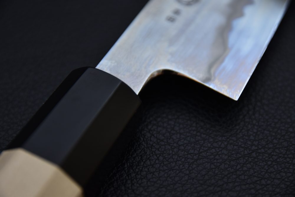 Considéré comme l’un des meilleurs forgerons de la région, Yoshikazu Tanaka est forgeron depuis plus d’un demi-siècle. Il travaille maintenant avec son fils et un apprenti. C’est un traditionaliste, mais il cherche toujours à améliorer son processus et ses compétences. Il utilise la méthode traditionnelle de trempe avec du charbon de pin et il utilise la cendre de paille par la suite. C’est une façon très ancienne de fabriquer des couteaux. Il n’utilise pas de thermomètre pour la trempe, il calcul manuellement la température de l’acier en examinant sa couleur. Tanaka-san cherche toujours à s’améliorer. Il utilise un four à température contrôlée pour la trempe, que seuls quelques forgerons de la région utilisent. Lui et son équipe ne forgent que 30 couteaux par jour entre eux trois. Pour référence, certains forgerons forgent jusqu’à 100 lames en une seule journée. La raison pour laquelle il n’en forge que trente est qu’il prend son temps, forgeant soigneusement à très basse température. À basse température, l’acier ne s’étire pas aussi vite, mais il conservera beaucoup mieux la granulométrie de l’acier. Étirer la granulométrie rendra l’acier cassant, ce qu’il s’efforce d’éviter. Il déplace fréquemment l’acier à l’intérieur et à l’extérieur du four pour vérifier la couleur, puis lorsque toute la lame est d’une nuance spécifique de couleur, il trempe l’acier dans l’eau. La tempe à l’eau (Mizu) est la plus difficle à réaliser et demande une manutention très soignée.