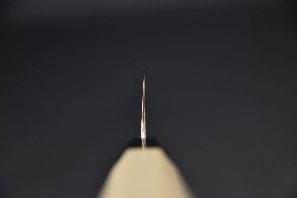 Le couteau Sujihiki se caractérise par son double tranchant, ce qui le rend accessible aux gauchers et aux droitiers. Il possède une lame longue et étroite avec un bout pointu, généralement d'une longueur de 240 à 300 mm et d'une hauteur de 30 à 40 mm.