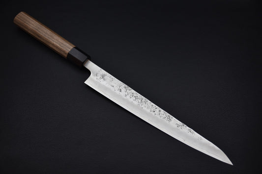Le couteau Sujihiki, dont le nom signifie « trancheur de chaire » en japonais, est une lame spécialisée conçue pour les découpes longues, nettes et précises. Contrairement aux couteaux de chef occidentaux souvent plus larges et épais, le Sujihiki se distingue par sa lame fine, longue et étroite. Ce format réduit les frottements lors de la coupe et permet de trancher des protéines cuites ou crues sans effort, en conservant l’intégrité des fibres. Sa lame à double biseaux, ce qui le rend plus facile à entretenir et adapté aux cuisiniers gauchers comme droitiers, contrairement au Yanagiba traditionnel. Léger, précis et maniable, le Sujihiki est une référence pour ceux qui recherchent une découpe fluide et délicate, notamment dans la préparation du poisson ou des pièces de viande sans os.