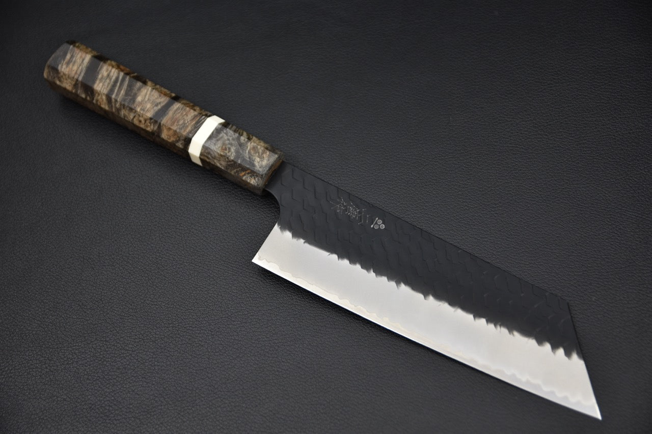 La lame est fabriquée en acier inoxydable SG2 (R2), un acier poudre reconnu pour sa grande capacité de coupe et sa bonne rétention du tranchant. Sa construction multicouche est associée à une finition kurouchi sombre sur la partie supérieure de la lame, complétée par un motif tsuchime martelé qui aide à réduire l’adhérence des aliments pendant la coupe. Le contraste entre la zone sombre texturée et la partie polie du tranchant met en valeur la ligne de trempe visible le long du fil.