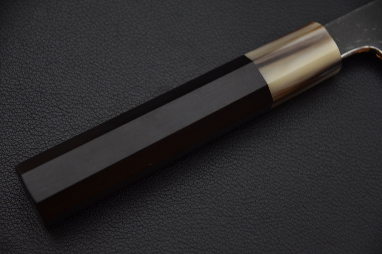 The handle is made from solid ebony with a buffalo horn ferrule, octagonal for a secure and elegant grip—suitable for both right- and left-handed users.