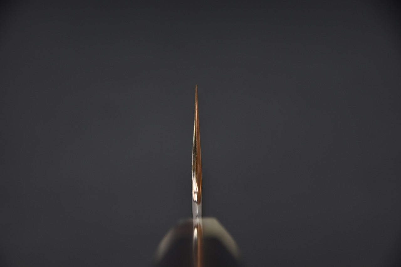 Its aggressive Bunka profile excels at fine cuts and tip work while remaining powerful enough for root vegetables.