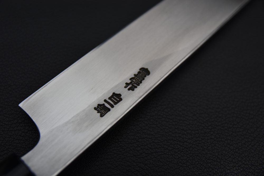 Yanagiba translates as “willow blade” since the narrow, long and curved blade shape on the back side resembles a willow leaf. The specialty of the Yanagiba is slicing fish in a precise and clean way for cutting sashimi or nigiri for example. It can also be used for filleting certain fishes and slicing meat. The very fine cutting edge can be damaged easily, so we advise you to be careful with bones. The concave back of the knife (urusaki) creates an air gap between the fish flesh and the blade, making it easy to detach the blade from the fish flesh, while the bevel on the face of the knife (shinogi) makes it easy to detach the piece of fish being sliced. The Yanagiba is generally found between 210 mm and 330 mm.