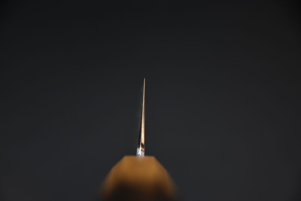 Hado's Sumi series is forged from Shirogami 2(number 2 white steel) by Master Blacksmith Yoshikazu Tanaka and honed by Tadataka Maruyama of Fukui Co & Ltd. Covered with oxidizable soft iron steel and sporting a beautiful kurouchi finish, the Sumi series will appeal to the more traditionalist among us who can appreciate the aspects of a full carbon blade. Built with a higher blade height, the Sumi series stands out from other Hado series. Coupled with Tadataka's concave grinding that gives a very thin edge, these blades can be described as laser-like. We recommend this series to professional cooks who have experience with full carbon blades, to traditional japanese knife enthusiasts and to anyone who is ready to make the leap into the world of carbon knives.