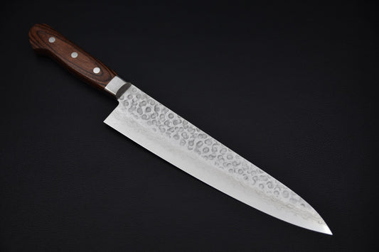The Japanese word Gyuto (牛刀) literally translates to beef sword. The gyuto is the equivalent of the Western chef's knife, and is designed to cut everything: vegetables, meats and fishes. It is made to be used with the push-cut method, lifting the blade between each cutting motion, or with the rocking motion method. It is important that the blade is straight upon impact with the cutting board to avoid damage to the knife edge.