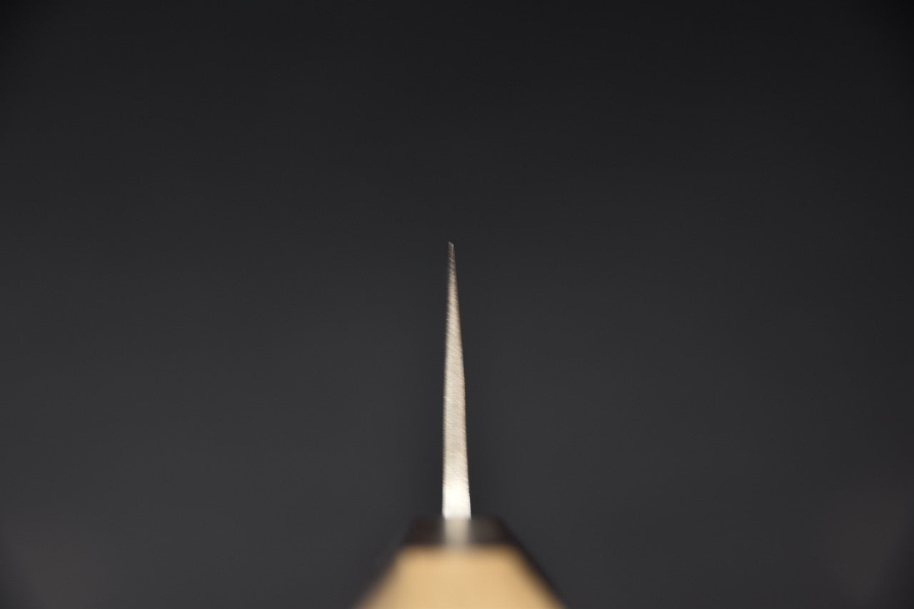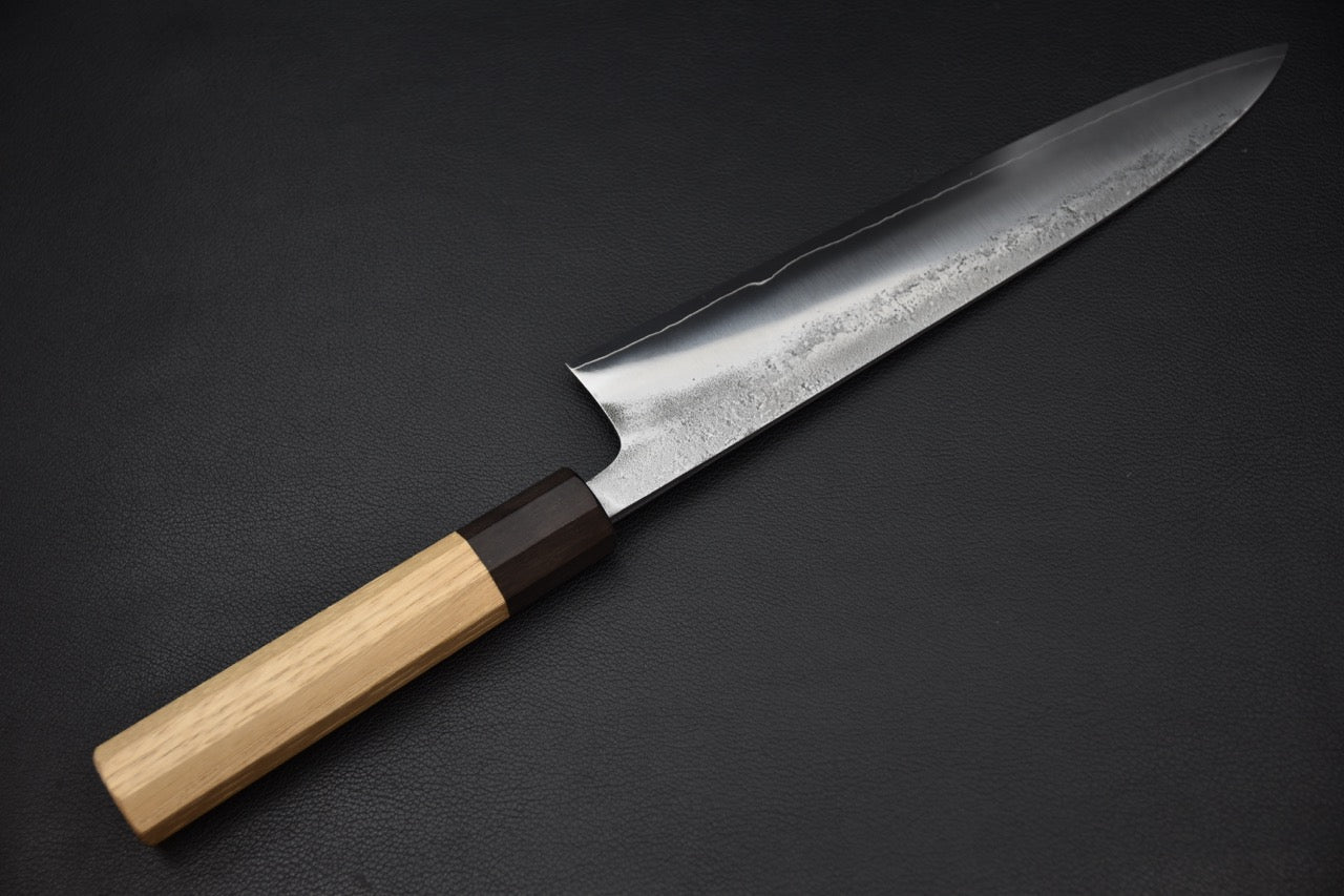 The knife is mounted with a Japanese wa handle in light wood, complemented by a dark bolster, offering a comfortable and well-balanced grip despite its 240 mm length. The whole remains light and agile, promoting smooth and controlled cutting during long work sessions.