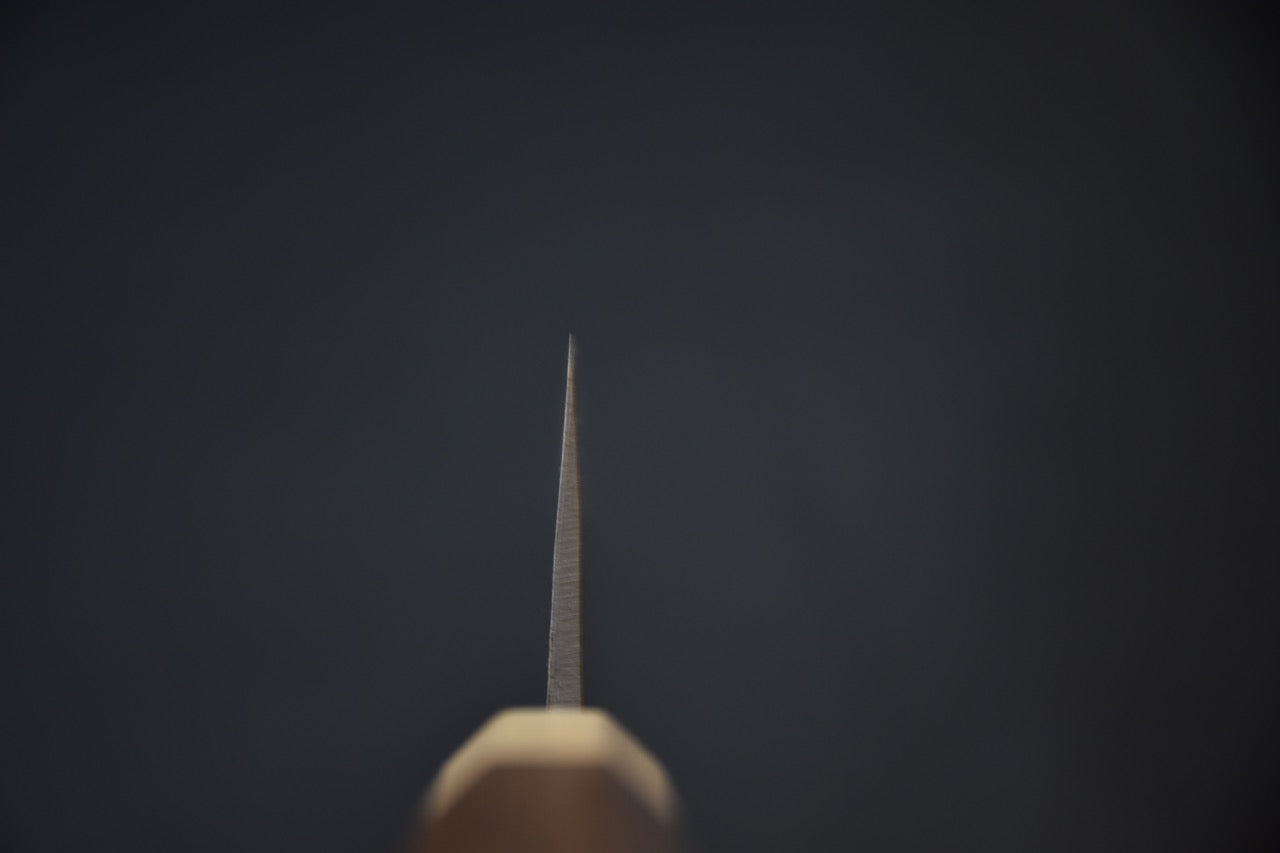 When using the Gyuto, it is crucial to ensure that the blade is perfectly straight upon impact with the cutting board. This helps prevent damage to the knife's edge, ensuring a precise and even cut while preserving the blade's durability. An incorrect impact angle can cause damage to the blade and affect the quality of the cuts. The Gyuto blade is made of high-quality Japanese steel, which gives it exceptional sharpness and high wear resistance. The steels used in the manufacture of Gyuto knives are heat-treated to high levels, allowing them to maintain their edge for a longer period of time compared to other types of knives. To extend the life of the Gyuto and maintain its sharpness, we recommend sharpening it regularly with a quality ceramic steel or using the leather block. As for sharpening on a stone, we recommend doing this once or twice a year for non-professional use. Sharpening on a stone must be done with care and precision, respecting the angle of the blade and following the proper techniques. If you prefer, we can take care of this through our expert sharpening service. If your Gyuto is made from rust-resistant steel, it is essential to take care to clean and dry the blade properly after each use to prevent rust and other moisture-related damage. If your knife is made of stainless steel, we still advise you to take care of it and not put it in the dishwasher, for example.